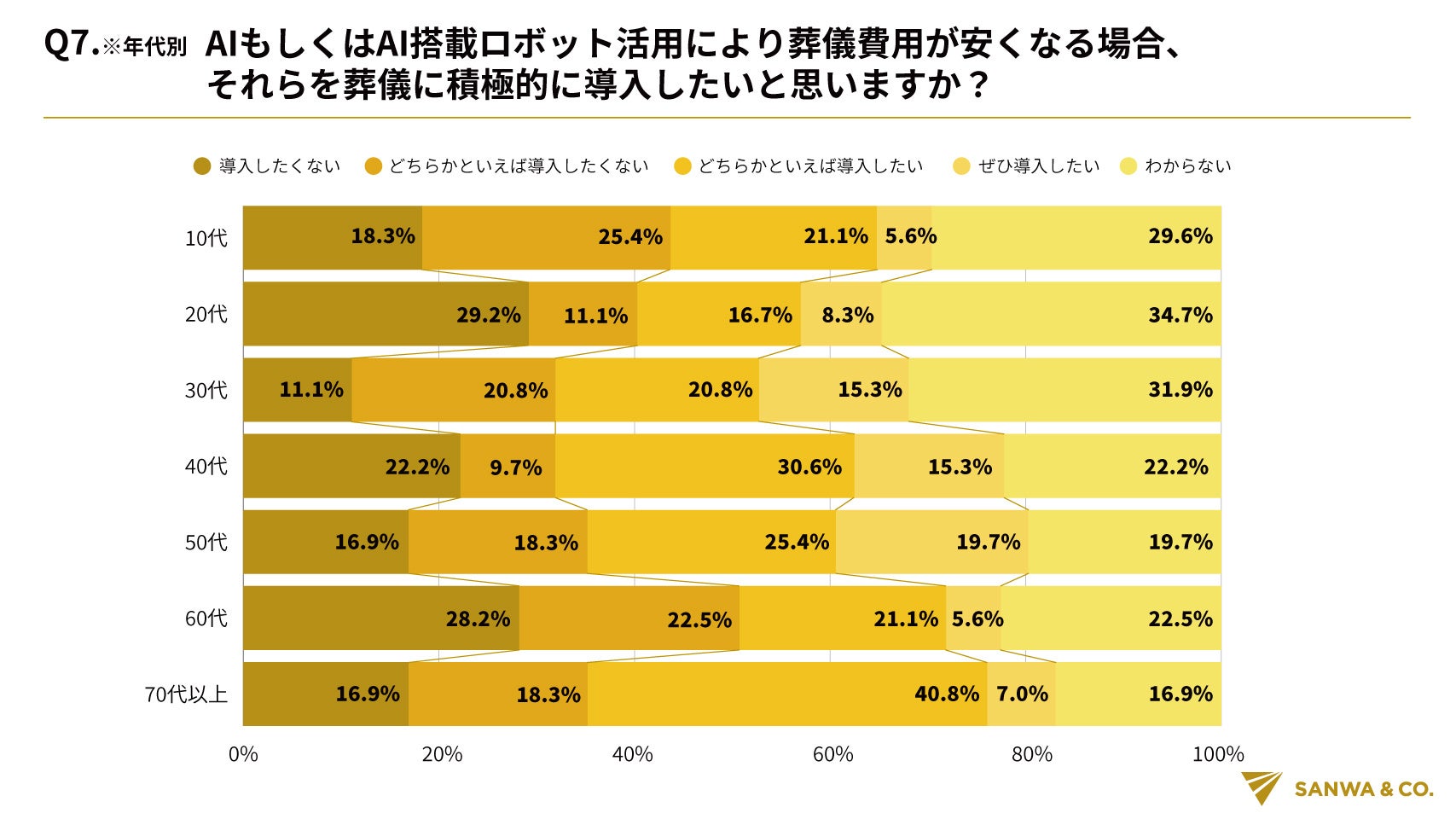 葬儀へのAI導入について、費用が安くなる場合でも「導入したくない」(38.4%)が「導入したい」(36.2%)を上回る結果となりました。一定のコストメリットがある場合でも、葬儀へのAI導入に抵抗感があることが明らかになりました。年代別では20代で「導入したくない」(29.2%)が、全世代中最も高い結果となっています。さらに「わからない」(34.7%)との回答も全世代中最多となっていることから、特に若い世代において、AIを受け入れるか否かが定まっていない実態が浮き彫りとなりました。