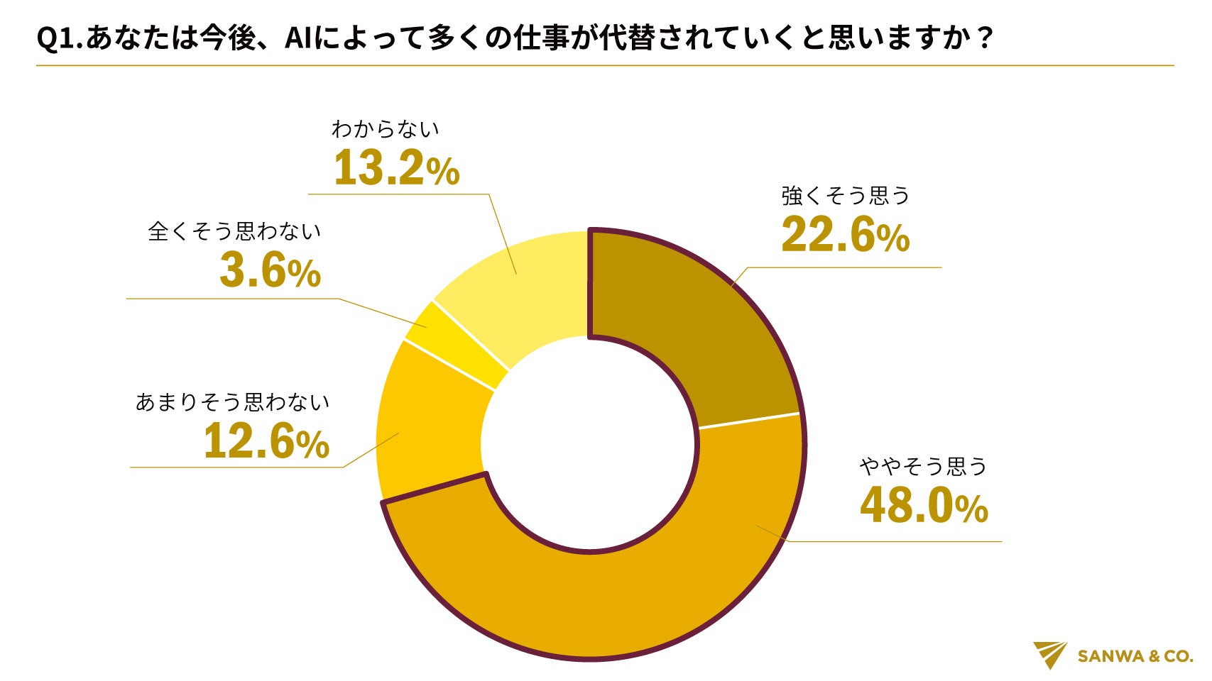 AIが多くの仕事を代替していくかを問う設問では、「ややそう思う」(48.0%)と「強くそう思う」(22.6%)の合計が70.6%に上るなど、AIによる仕事の代替が進むと捉えていることがわかりました。
