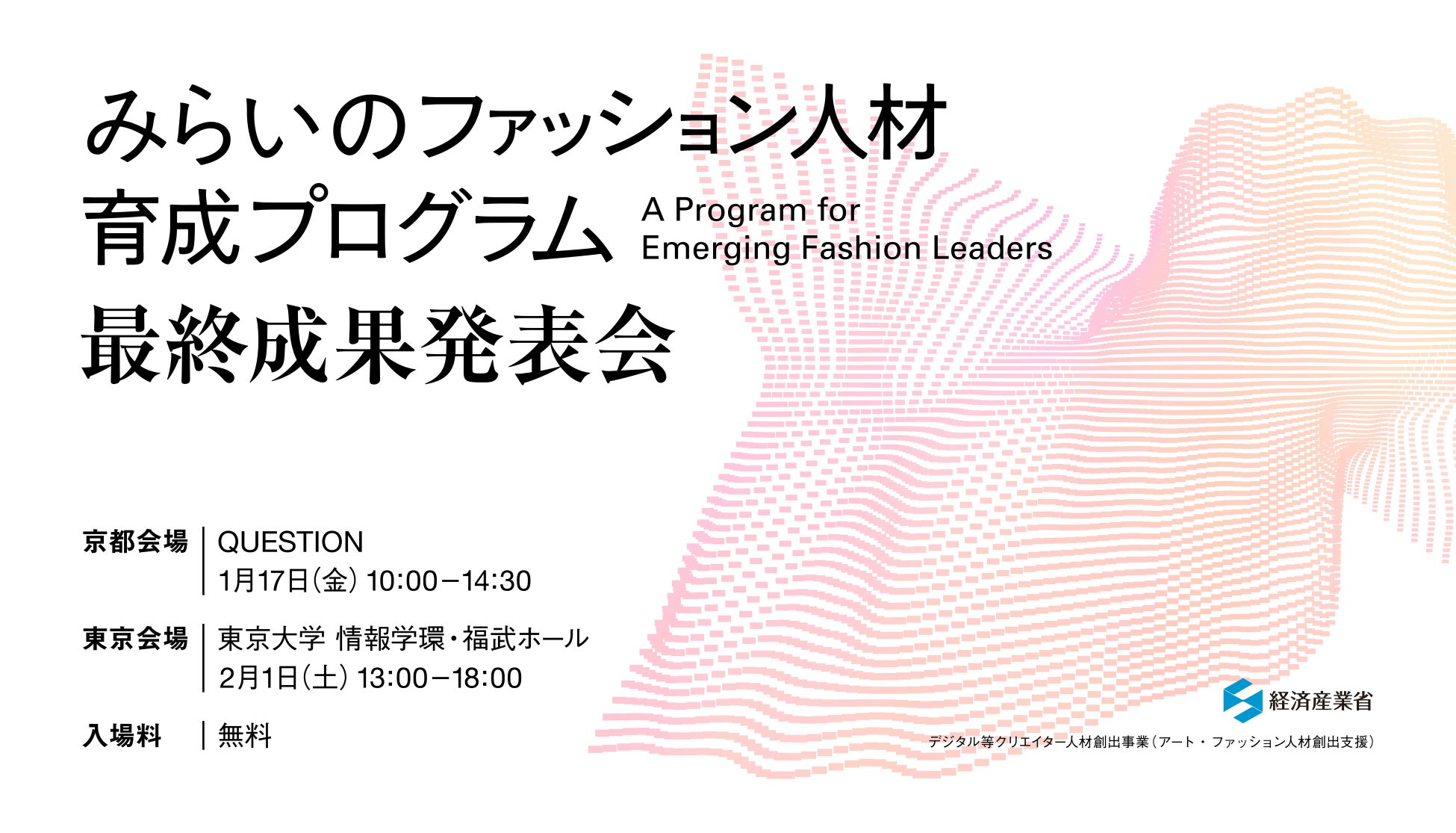 経済産業省が主催し、株式会社インフォバーン(本社:東京都渋谷区、代表取締役会長:小林弘人、代表取締役社長:田中準也、TNLメディアジーン グループ企業、以下インフォバーン)が事務局を務める「みらいのファッション人材育成プログラム」の最終成果発表会を、2025年1月17日には京都で、2月1日には東京で開催いたします。