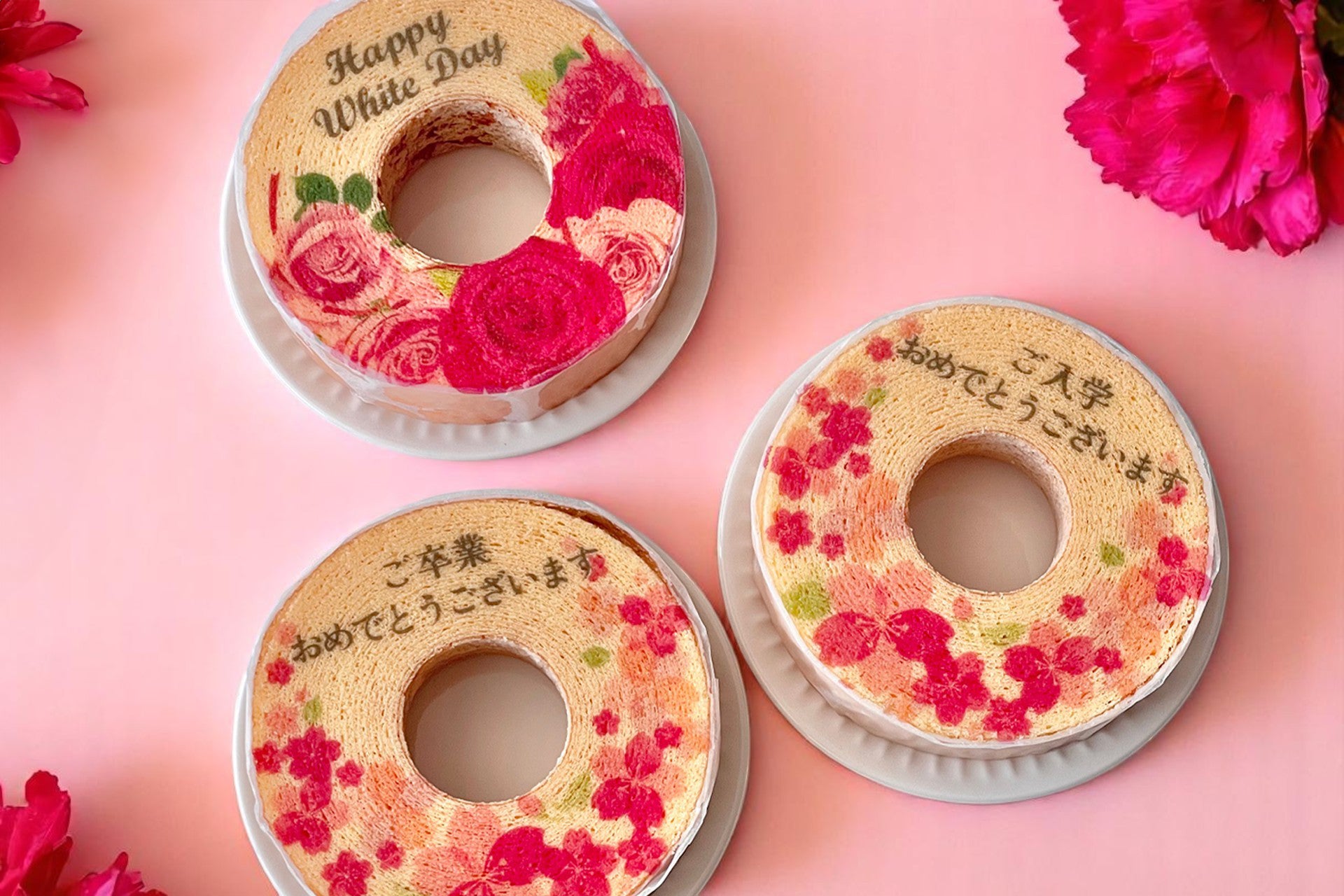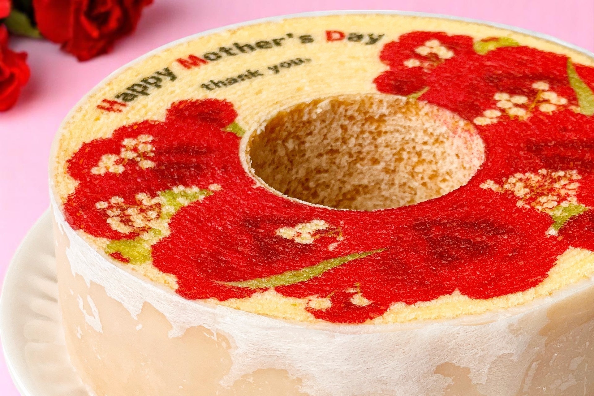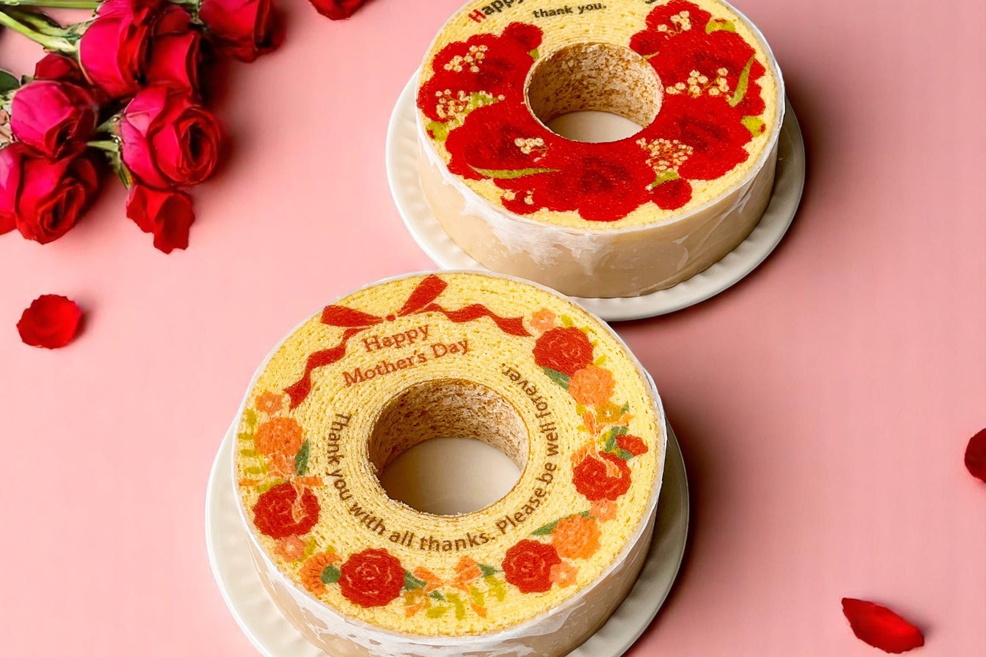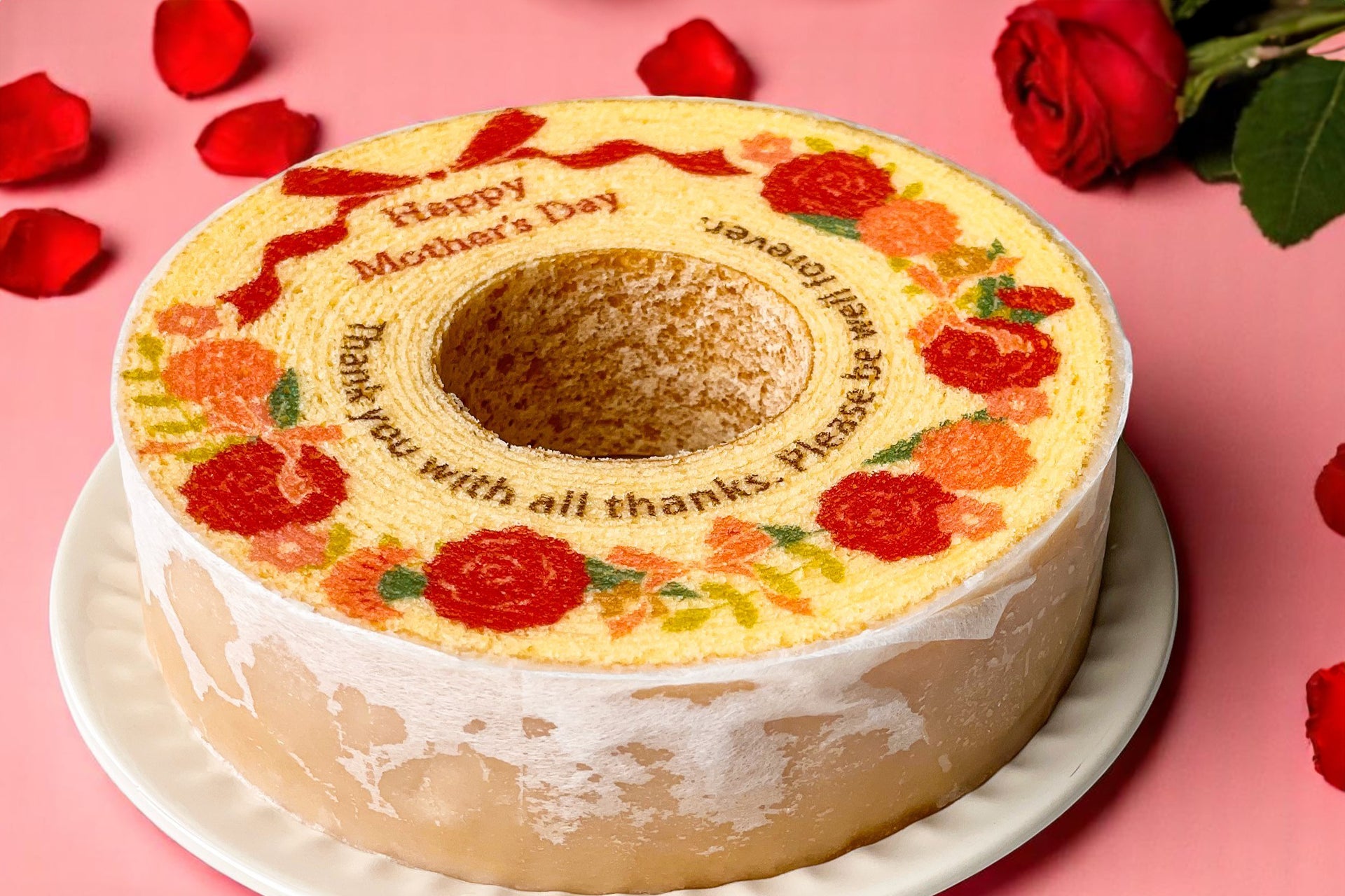しっとりもっちり食感に焼き上げた米粉100%のバウムクーヘンに、華やかな花柄と「HAPPY MOTHER’S DAY」の文字を直接プリント。