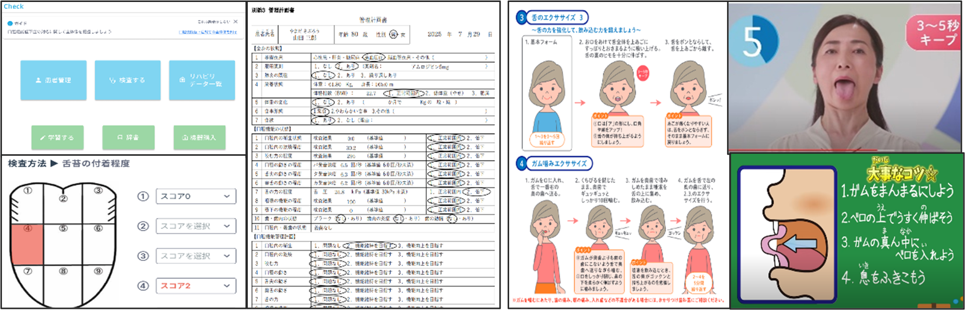 人びとの口腔機能の改善を目指すとともに、限られた時間やスタッフでも対応できるように開発された検査ガイドや書類作成機能、リハビリ提案サービスを備えることで、歯科医院の「日々の診察業務」と「社会的に要求される口腔機能管理」の両立をサポートします。