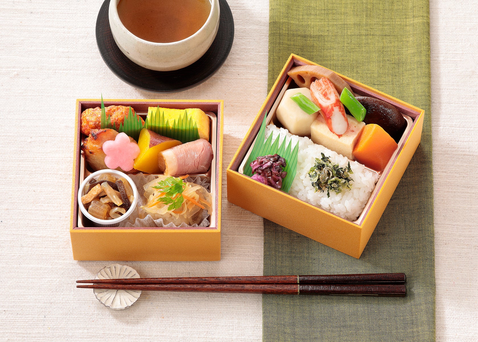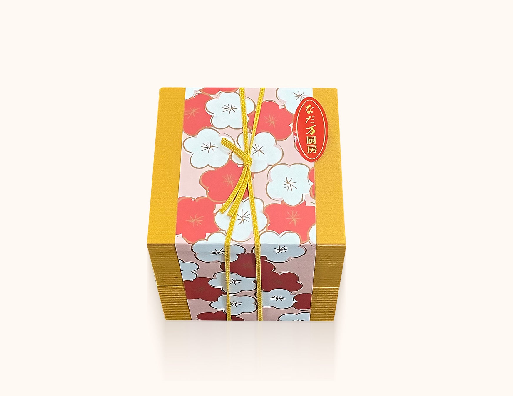 橙黄色の二段の折箱に、華やかな梅柄の掛け紙で晩冬の景色をイメージしました。なだ万ならではの出汁の風味豊かな煮物、ふっくらと蒸してから焼き目を付けた「若鶏西京焼」、時間をかけて味をまとわせた優しい味わいが特徴の「丸十蜜煮」のように丁寧に仕上げた日本料理の魅力が詰まった季節弁当です。二段のお弁当を広げるワクワク感とともに、贅沢なリラックスタイムをお過ごしください。