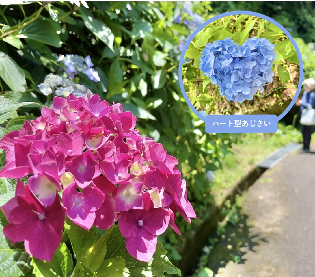 なかでも注目なのが、SNSでも話題の「ハート型あじさい探し」。自然がつくり出す愛らしい形のあじさいは、写真映えも抜群!カップルや家族連れ、写真愛好家にとっても見逃せないスポットです。