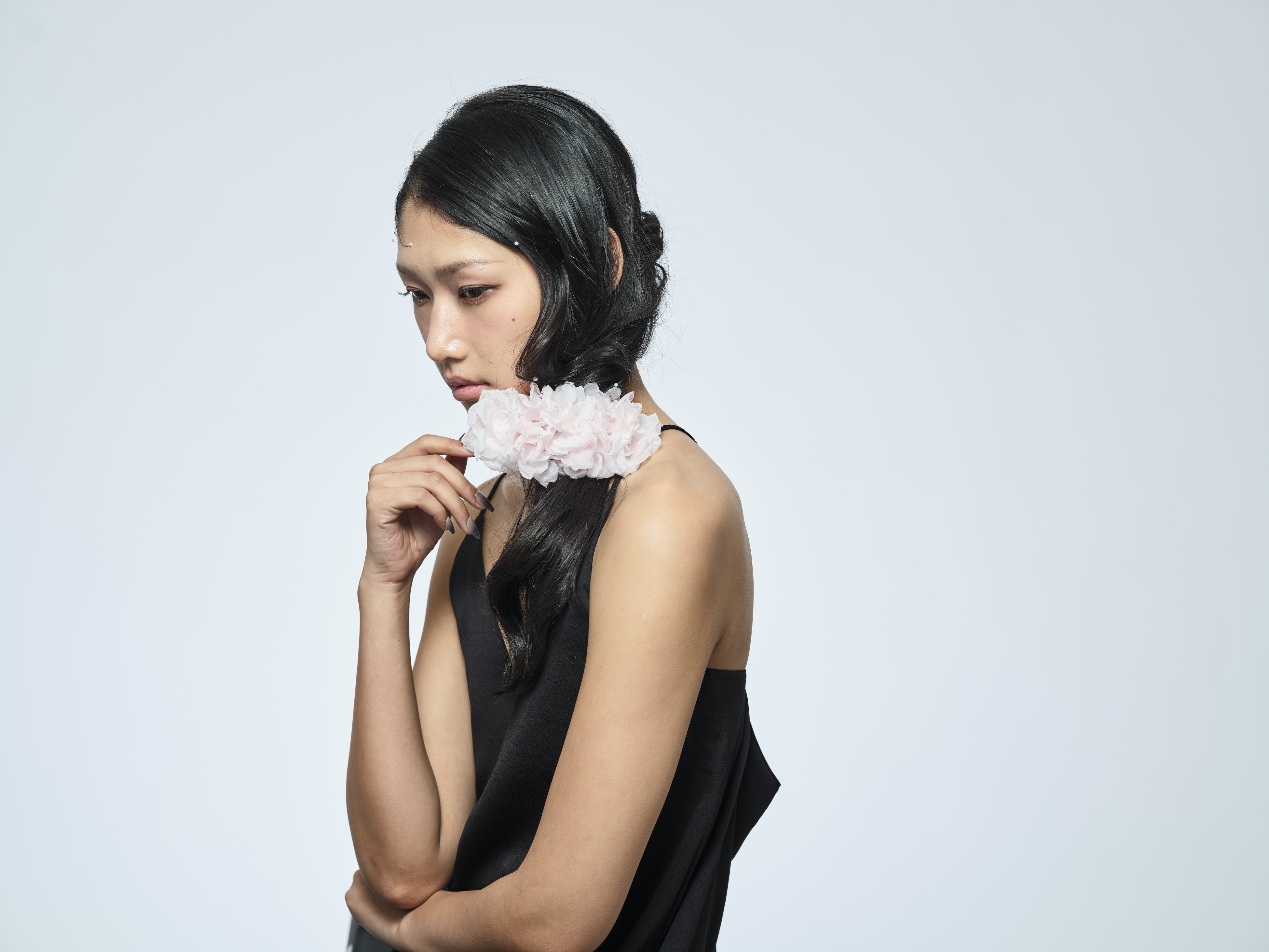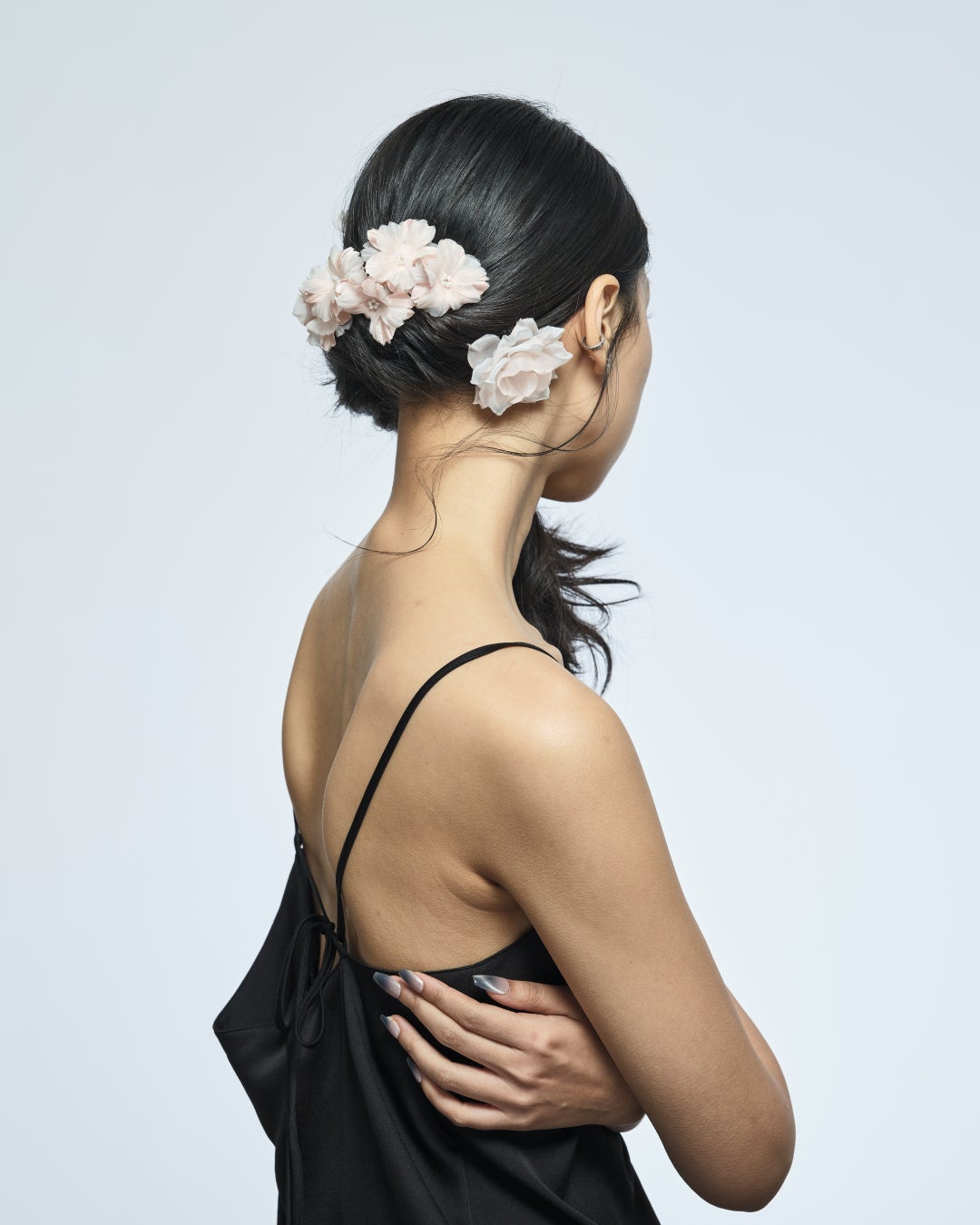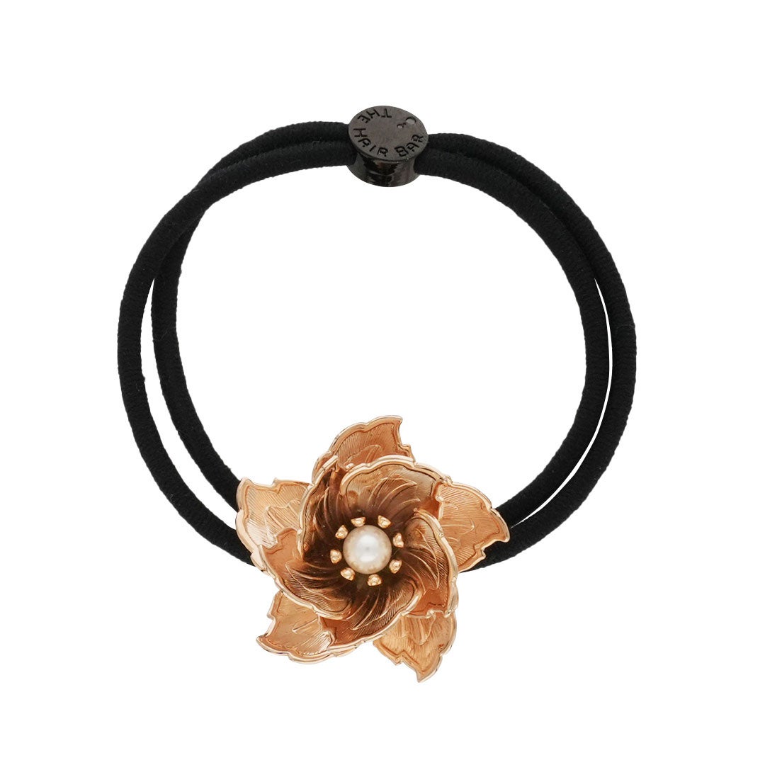 <THE HAIR BAR TOKYO>オリジナル、花かんざしを思せるモチーフのエキゾチック・シックなポニー、10cmバレッタと、ミニコームの3アイテムは肌なじみの良いローズゴールド仕立げに。中心にあしらった樹脂パールは“made in Tokyo” ならではの細やかな手仕事の結晶。立体的に重なり合う花びらは、どの角度からも洗練された造形美を楽しむことができます。甘さを抑えた都会的でモダンなSAKURAが日常のカジュアルなスタイルをアップグレードします。