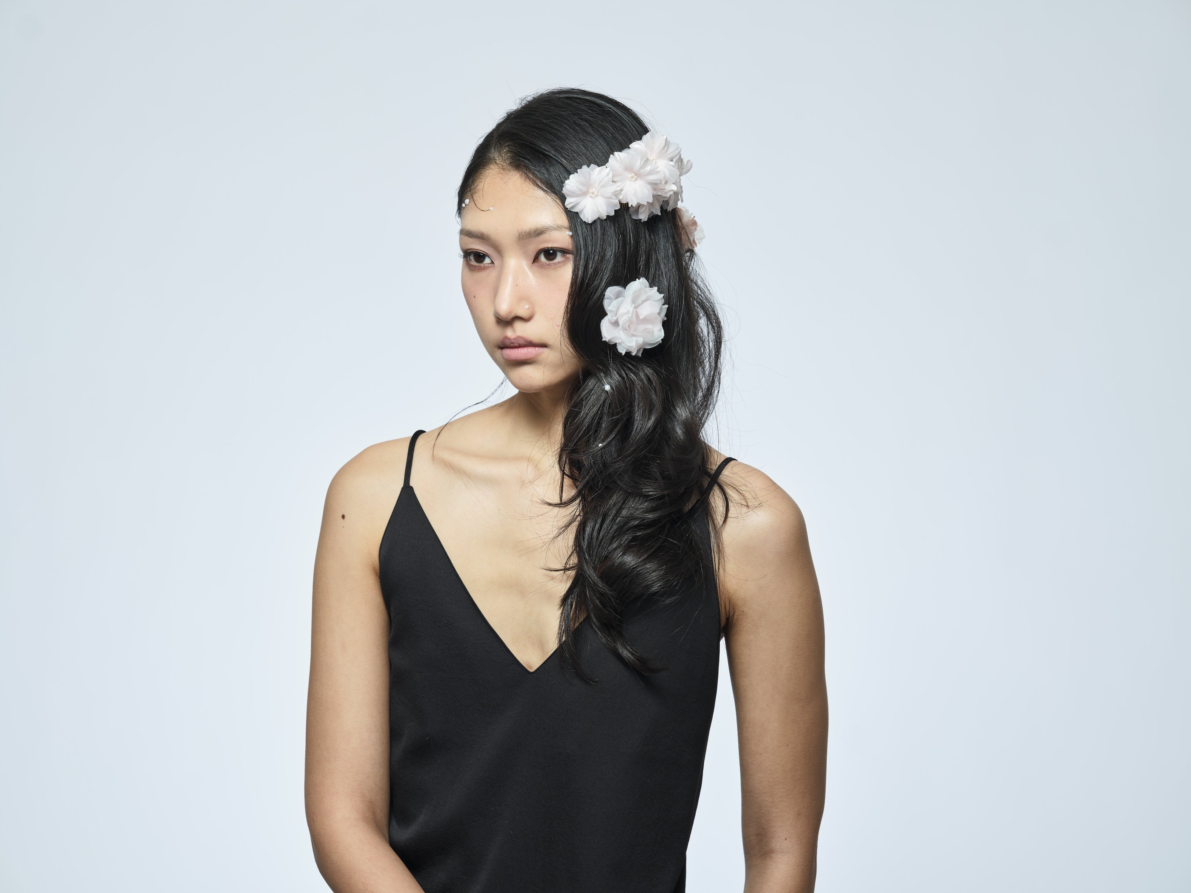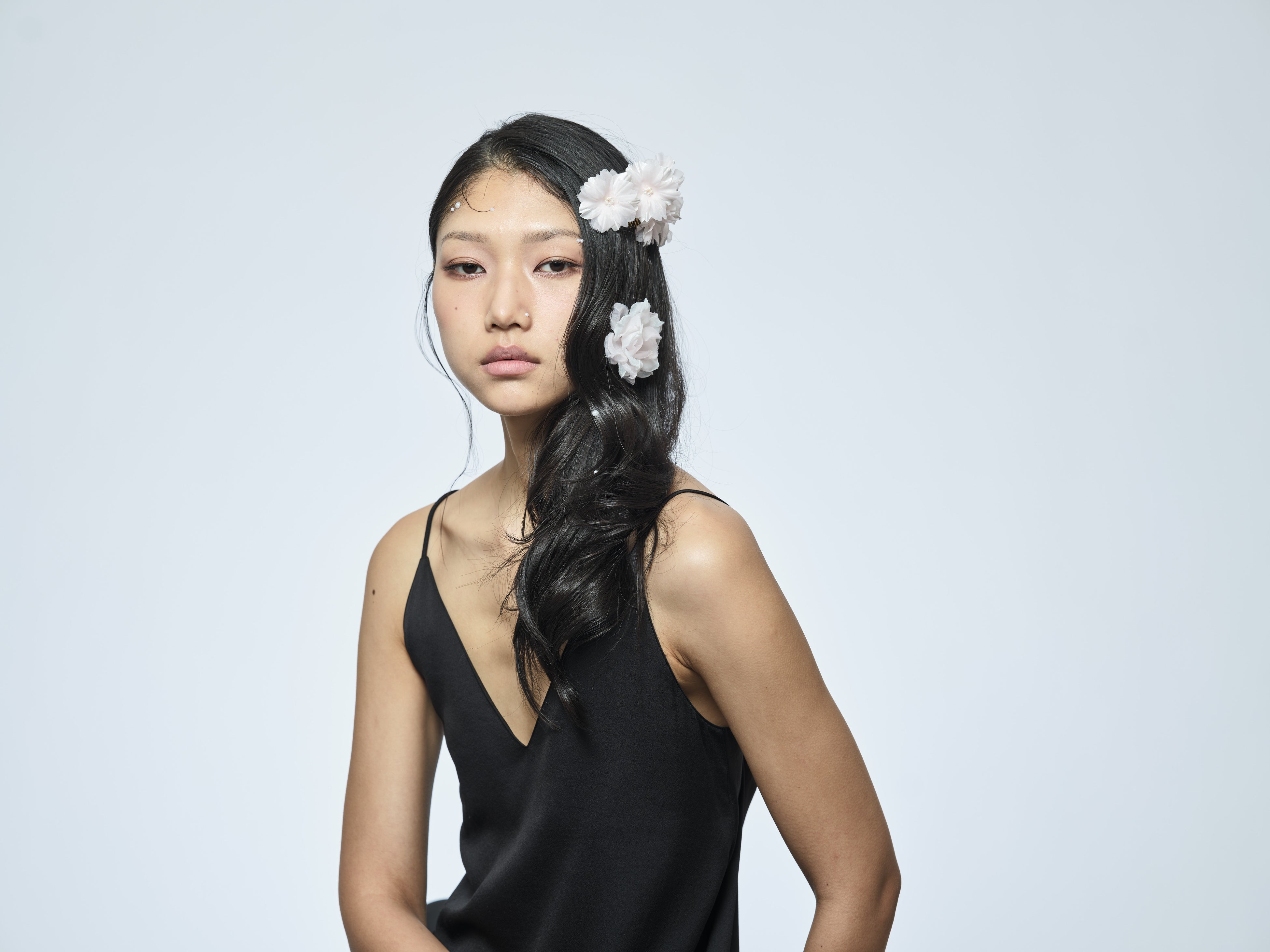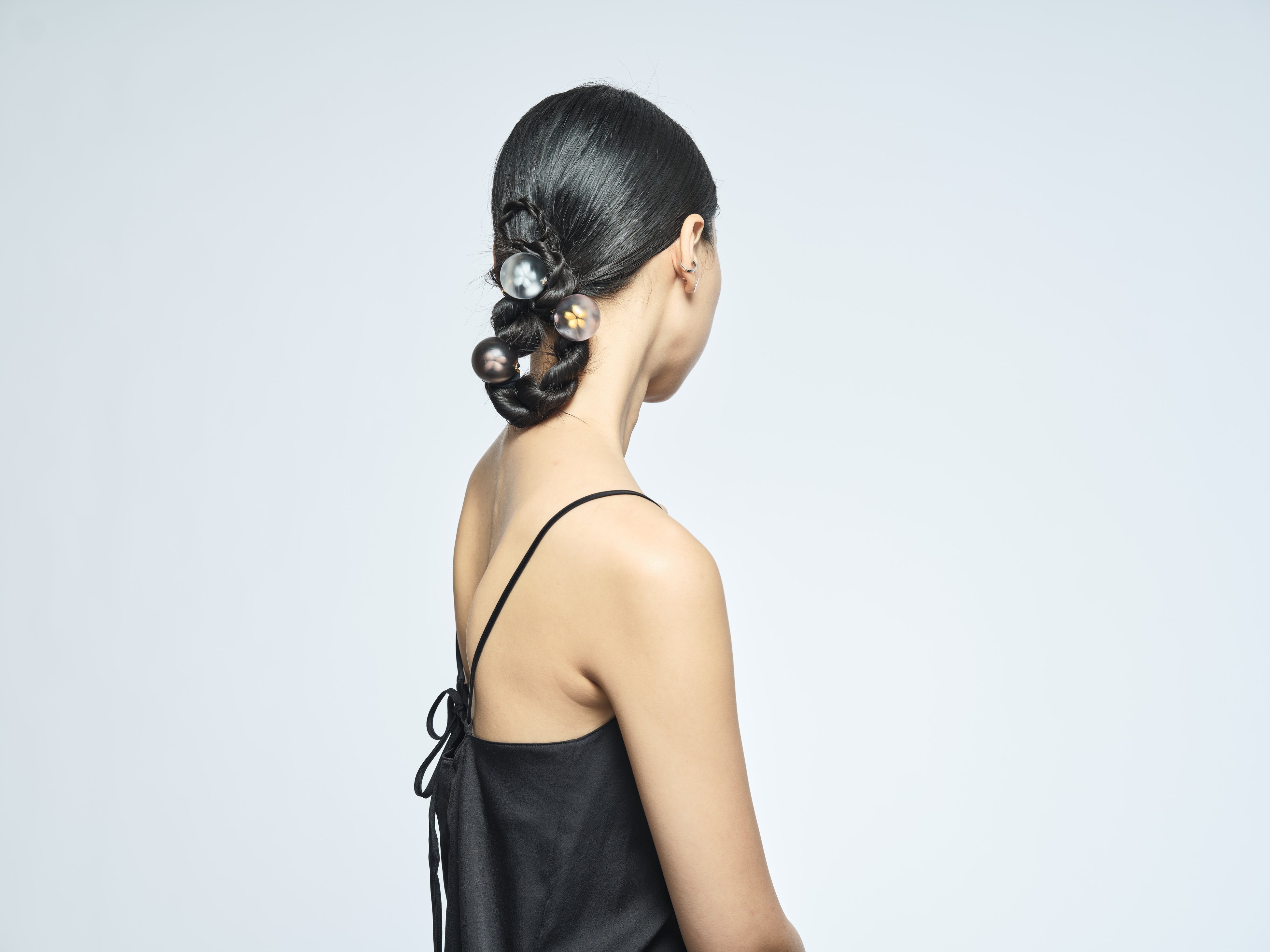 <THE HAIR BAR TOKYO>オリジナル、花かんざしを思せるモチーフのエキゾチック・シックなポニー、10cmバレッタと、ミニコームの3アイテムは肌なじみの良いローズゴールド仕立げに。中心にあしらった樹脂パールは“made in Tokyo” ならではの細やかな手仕事の結晶。立体的に重なり合う花びらは、どの角度からも洗練された造形美を楽しむことができます。甘さを抑えた都会的でモダンなSAKURAが日常のカジュアルなスタイルをアップグレードします。