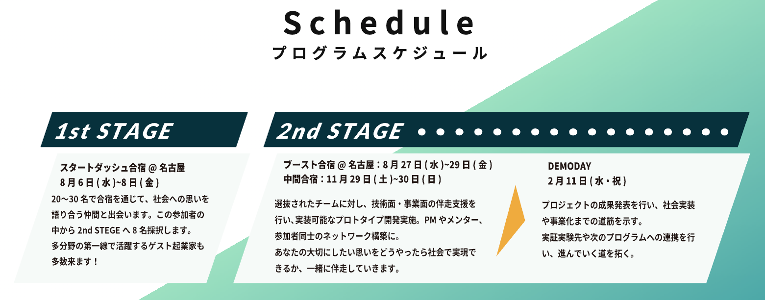 経済産業省「AKATSUKIプロジェクト」の採択事業として、東海4県(愛知・岐阜・三重・静岡)の若手を対象に実施される、社会課題解決とテクノロジーを掛け合わせた起業家育成プログラムです。 最大の特徴は、アイデアやピッチの完成度を競うだけでなく、プロトタイプ開発と現場での実証を行う「社会実装」を最終目的に据えている点です。