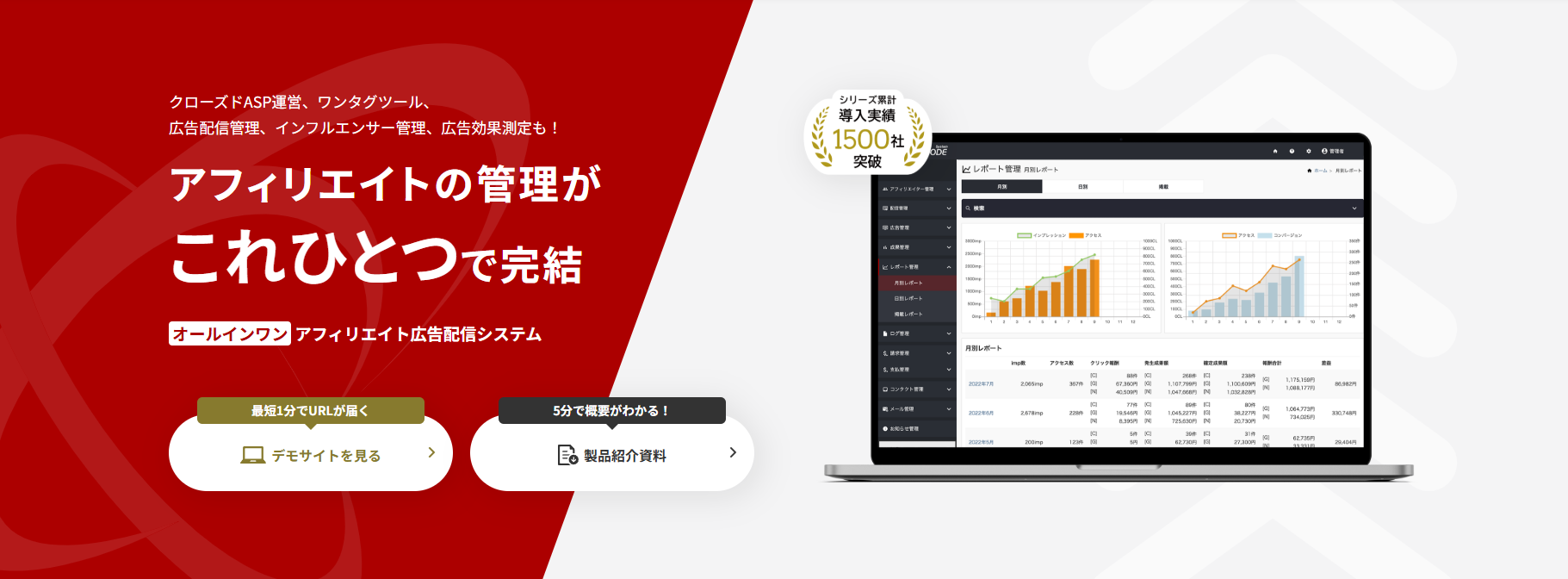 シリーズ累計の導入実績が1,500社を超える、サブスクリプション型の多機能アフィリエイトシステム。ASP運営・広告の効果測定・広告の配信管理など、目的に応じた柔軟な運用が可能です。