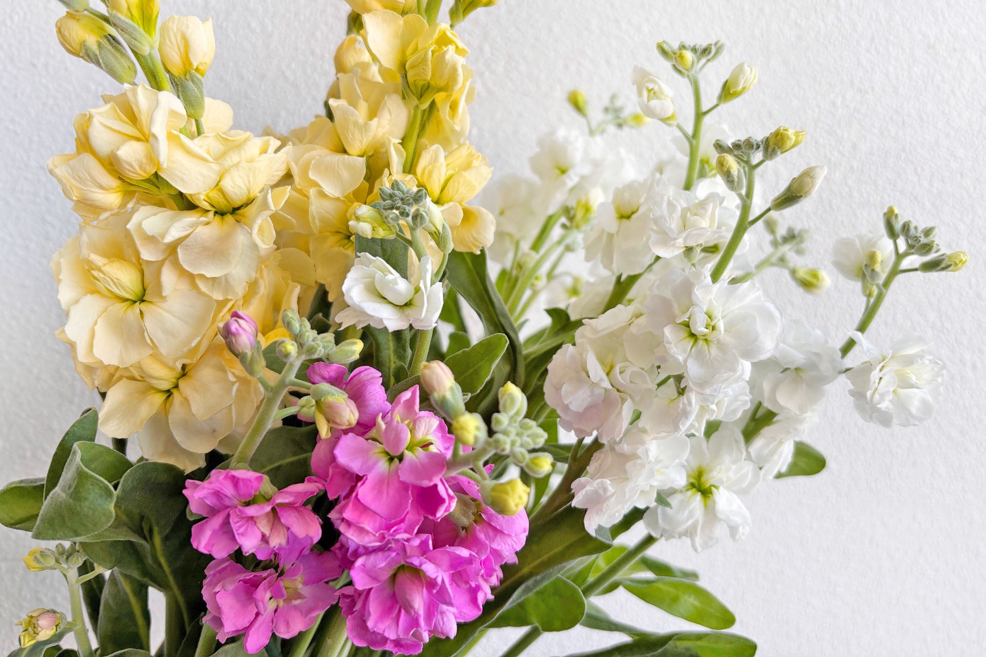 旬のスイートピー、ストック、フリージアは甘い香りが高く、キンギョソウやカーネーション、バラはホイップクリームのような花姿が愛らしく、そしてヒペリカムはいちごの形状に似ているなど、このような花を飾ることでスイーツ感をより感じることができ、旬を楽しんでいただくことができます。