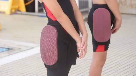 若吉教授が開発した「フラットヘルパー」は、ネット素材の補助パンツの両側ポケットに、空気の入ったペットボトルを入れて使用することで、沈みがちな下半身浮力を補い、体を浮きやすくします。「フラットヘルパー」を使用することで、泳ぎの苦手な子どもも“水平に浮く”という感覚を容易に身に付けることができます。また、水に浮くことに怖さを感じる子どもに、フラットヘルパーを装着してもらうことで安心感を与えることができ、教員が子どもにチャレンジを促しやすいという効果もあります。
