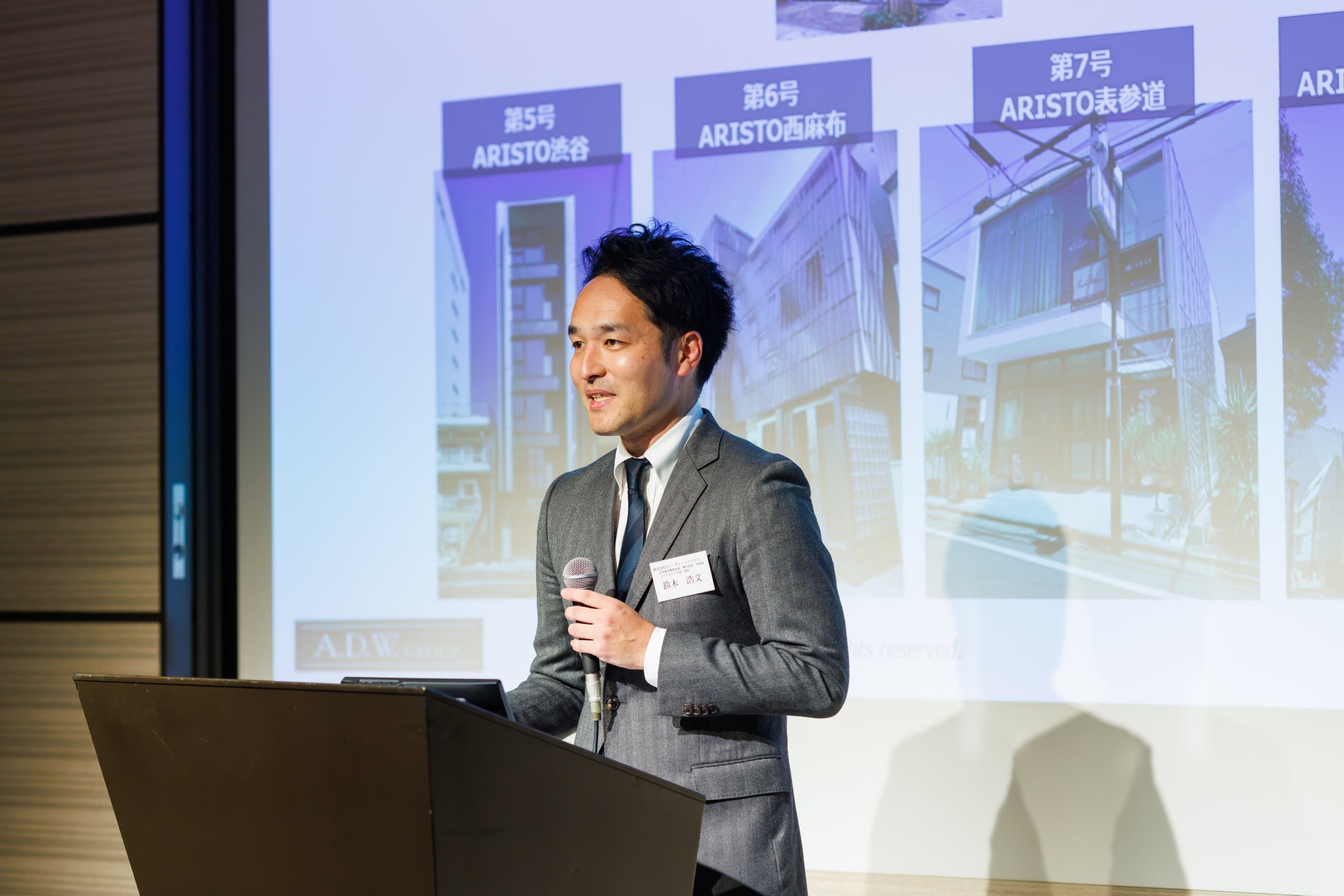 続いて、株式会社エー・ディー・ワークス(以下、「ADW」) 執行役員 鈴木浩文より不動産小口化商品「ARISTO」の最新動向の解説が行われ、高い稼働率やそれによる販売時想定を上回る平均分配金利回りの実績など、好調な運用状況をお伝えいたしました。加えて、新商品であるオフィス区分所有権「ARISTO PLUS」についてもADW 資産運用事業本部 山田悠哉よりご説明させていただきました。