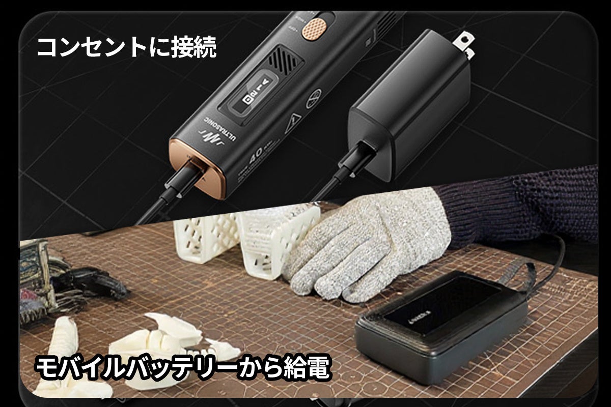 「超音波カッターは消費電力が高いので、コンセントに接続しなければならない」という従来の常識を覆し、モバイルバッテリーからの給電でもスムーズ動作可能※!