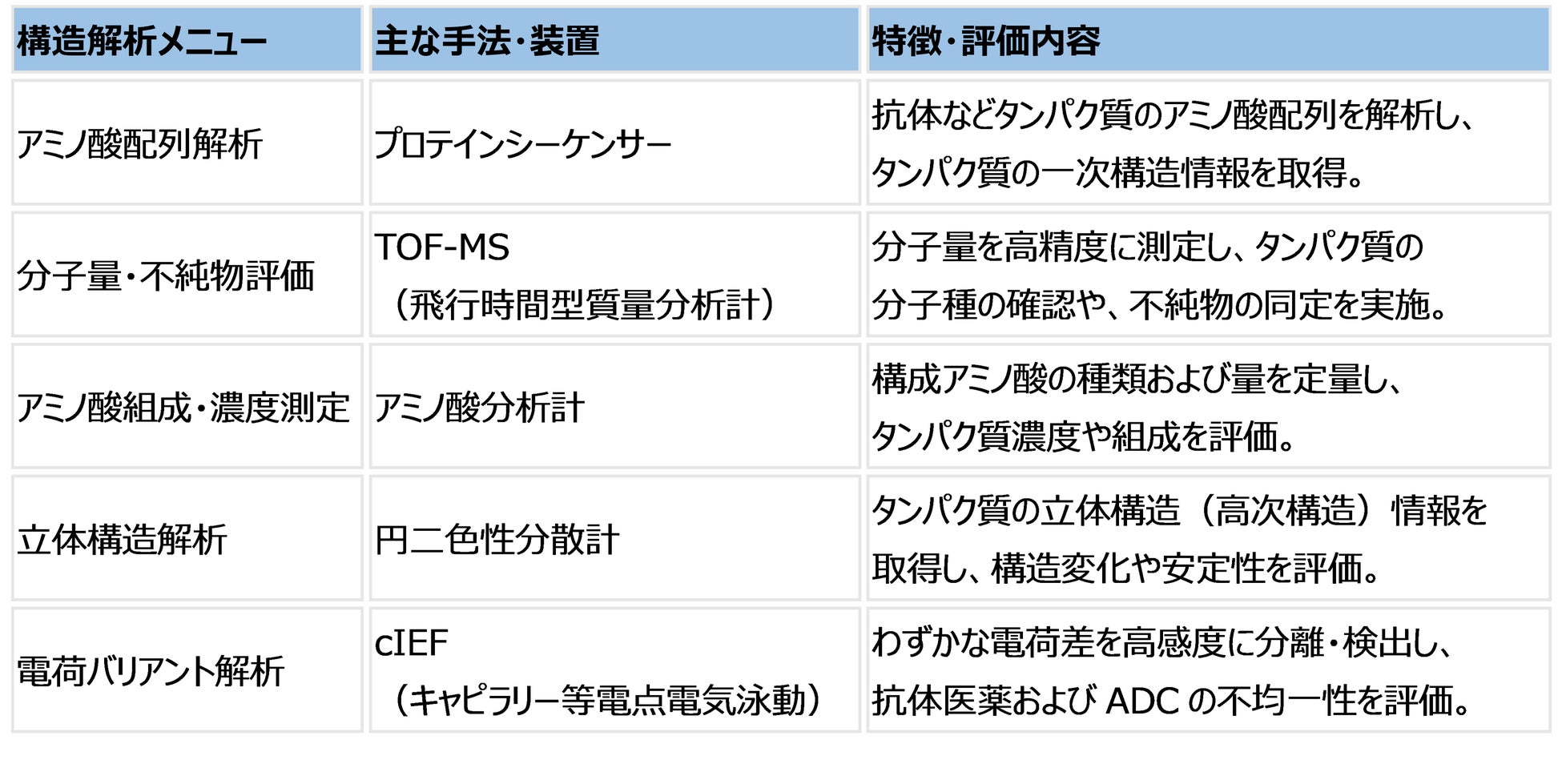 TRCでは、GMPのもと、構造解析メニュー(図1)を整備し、抗体医薬の重要な品質属性を適切に評価できる体制を構築しています。