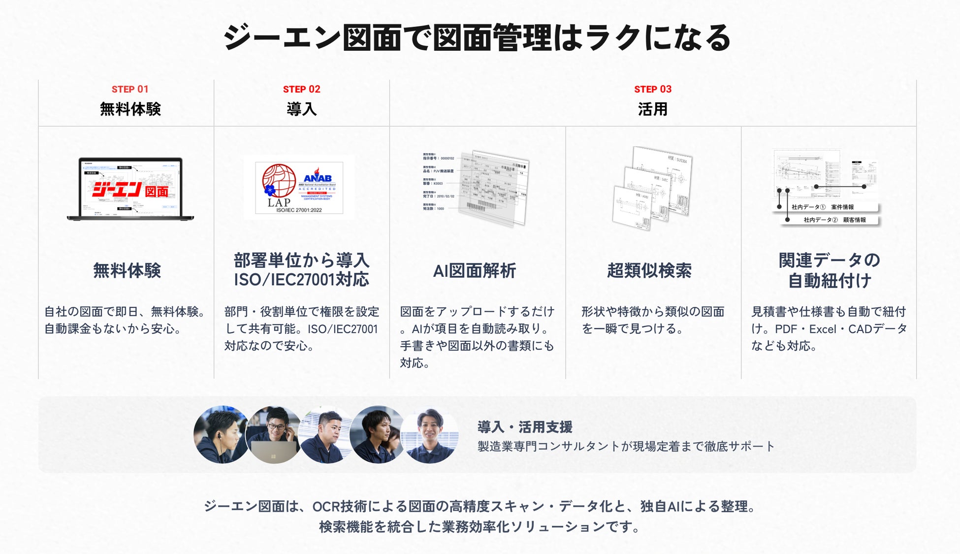 また、ジーエン図面はシステムを導入して終わりではなく、現場で活用され、定着するところまでを重視しています。製造業専門のコンサルタントが伴走し、現場のオペレーションやデータ管理体制に合わせた活用方法を提案するほか、既存データ基盤からの移行支援や利用者向け説明会の実施など、導入後の活用まで支援します。