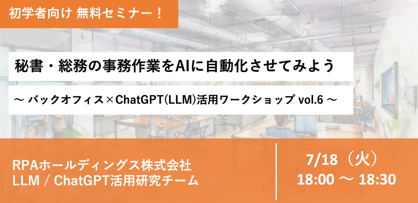 RPAホールディングス(本社:東京都港区、代表取締役:高橋 知道、以下「RPAホールディングス」)は、無料のオンラインセミナー「秘書・総務業務の事務作業をAIに自動化させてみよう~バックオフィス×ChatGPTワークショップ vol.6」を開催致します。