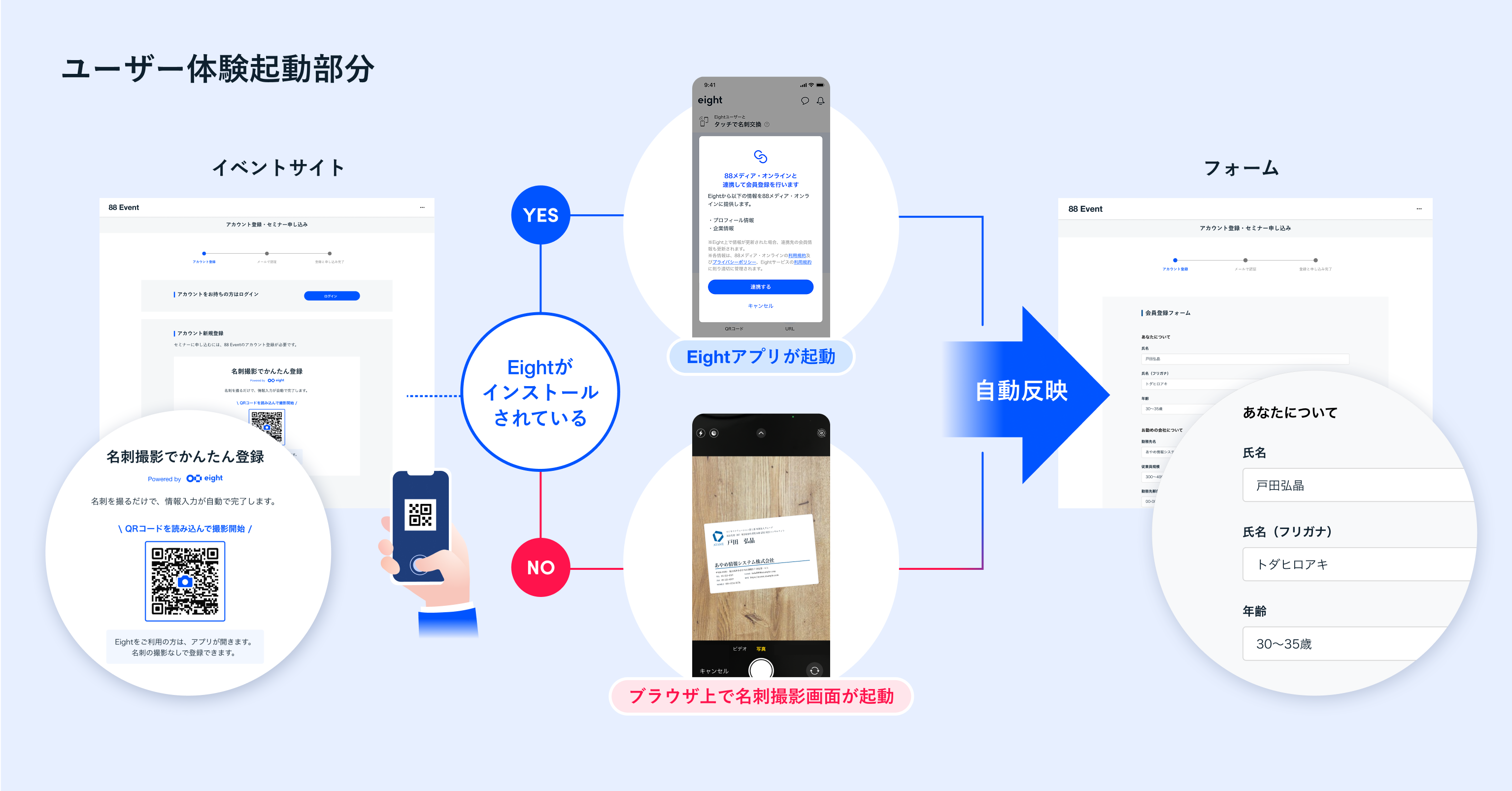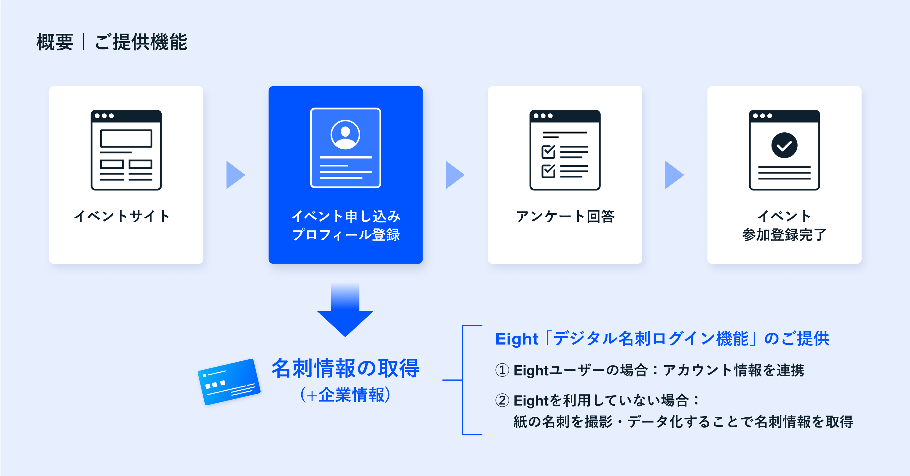 今回の連携は、Eightの「デジタル名刺」を活用した参加登録機能をEXPOLINEに組み込むことで、これらの課題を解決します。参加者には簡単でスマートな登録体験を提供し、主催者には信頼性の高いデータを提供することで、イベント全体の価値向上に貢献します。