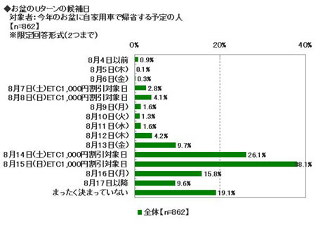 次に、Uターンする日を同じく限定回答形式で尋ねたところ、最も回答が多かったのは「8月15日(日)」(38.1%)、続いて「8月14日(土)」(26.1%)、「8月16日(月)」(15.8%)となっています。