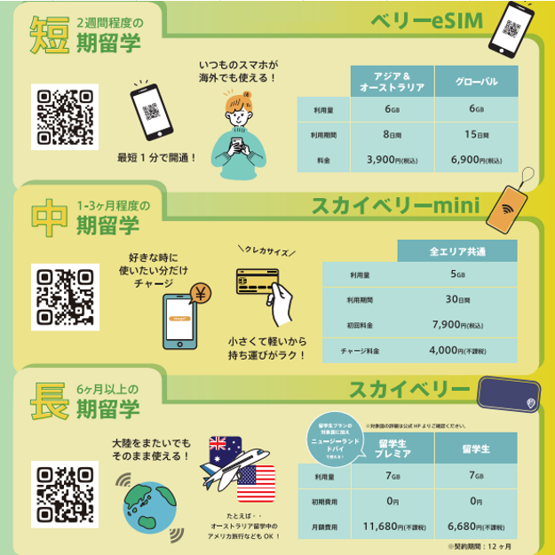数週間の短期留学にはベリーeSIMⓇ のご利用が最も便利で経済的です。事前に日本でアクティベートすることも可能で、出発前に通信確認ができ安心してご出発いただけます。申込み後に届く二次元コードを読み込むだけで、最短1分で使えます。