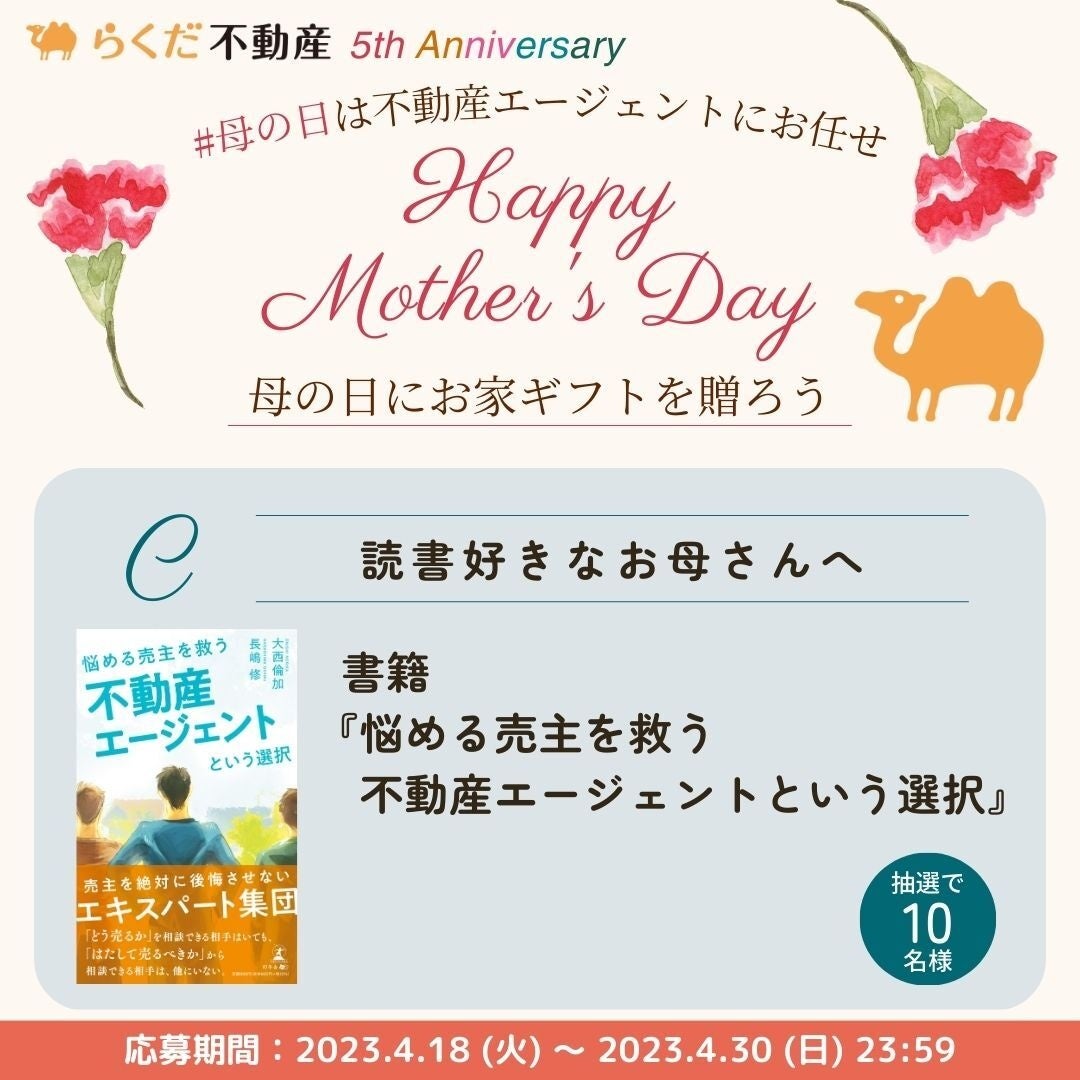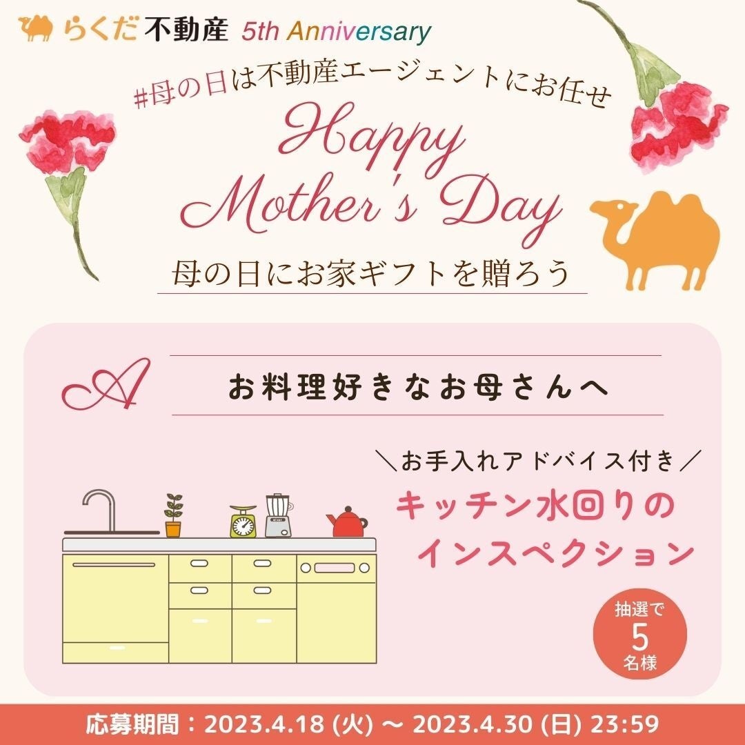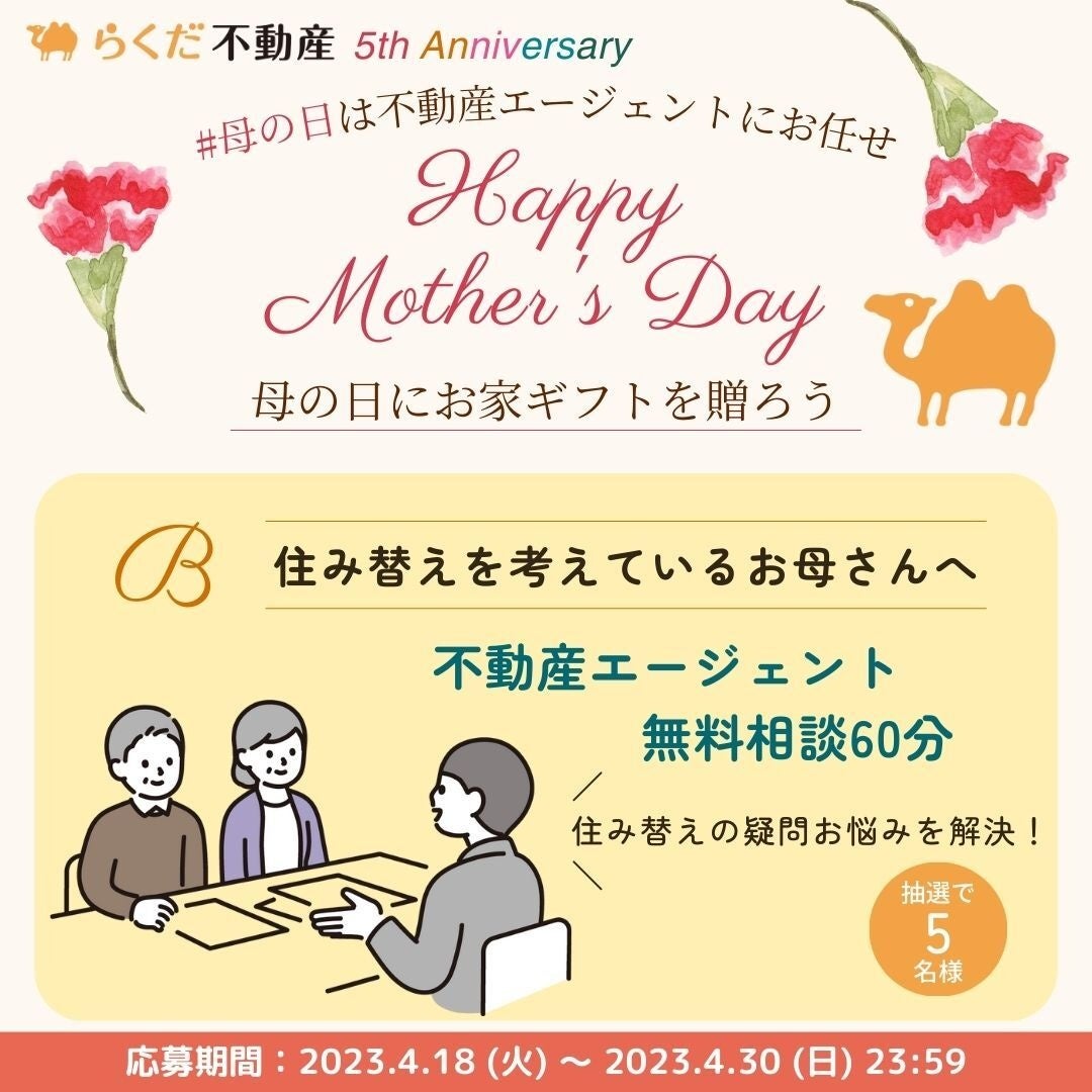 「らくだ不動産“幸せ”プロジェクト」第一弾として、「母の日にお家ギフトを贈ろうキャンペーン」を2023年4月18日より開催いたします。母の日のプレゼントにぴったりなお家ギフトをらくだ不動産がご提案。大好きなお母さんへ“ありがとう”の気持ちを伝えるお手伝いをいたします。母の日は不動産エージェントにお任せください。