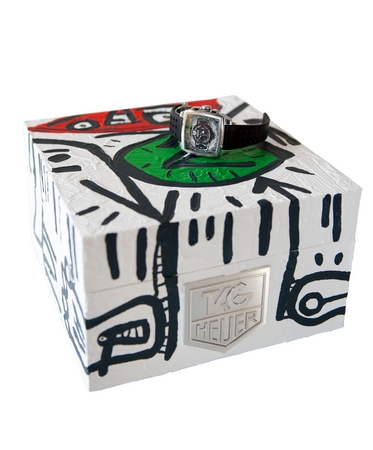 この唯一無二の逸品は、ブラック ラッカーとシルバー オパーリンを交互に組み合わせた特別なデザインが施され、ダイアルの針と“バレニア”カーフスキンを用いたブラックのストラップのライナーには、燃えるようなレッドが用いられています。ネルソン・マンデラ氏とのコラボレーションによるチャリティアートで知られる南アフリカのアーティスト、ポール・デュ・トワ氏が、〈モナコ マイクログラフ〉の独創的なボックスを手がけました。
