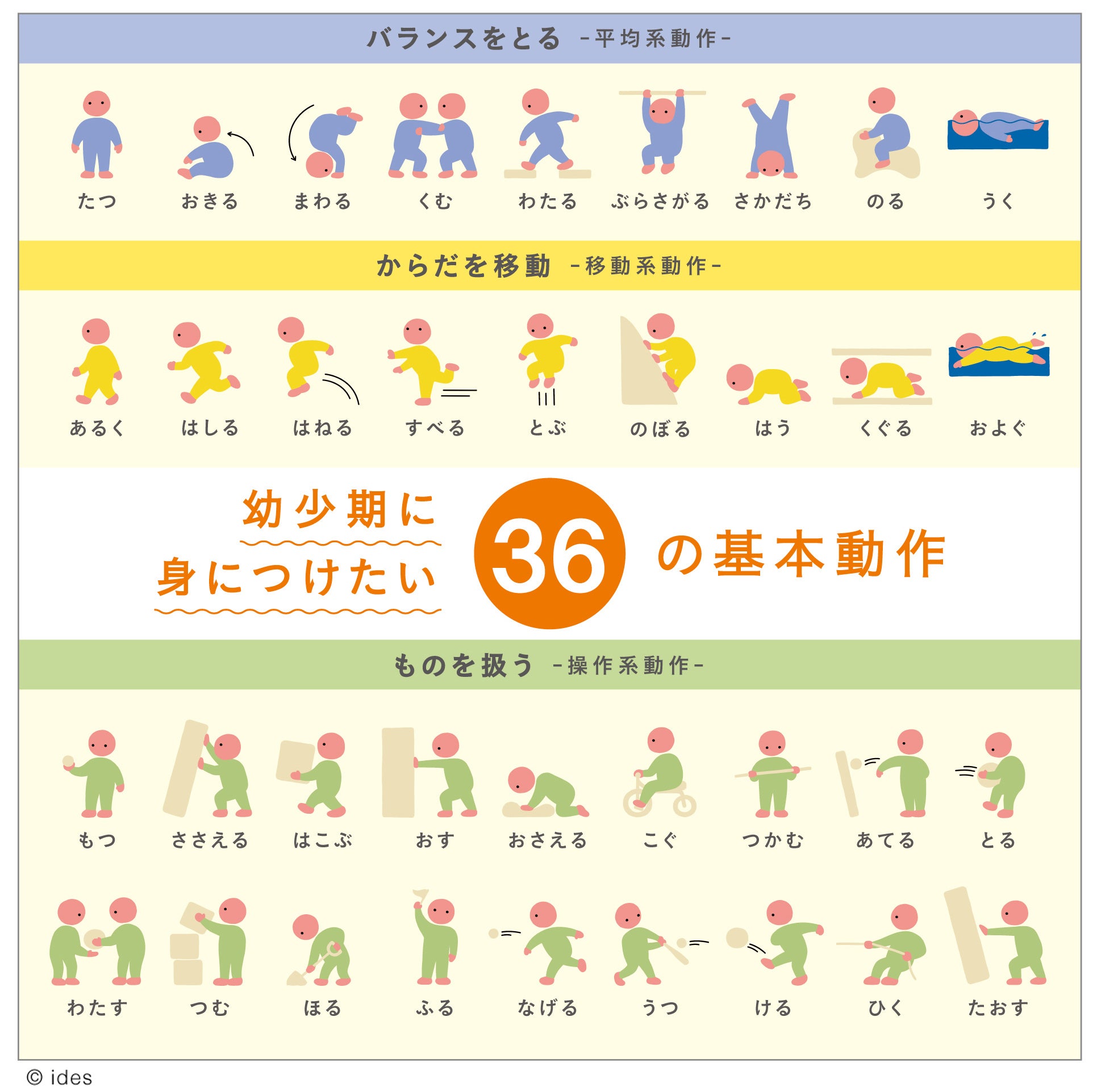 ※子どものあそびの重要性に関する研究では我が国の第一人者である国立大学法人山梨大学学長中村和彦氏が提唱するバランス系9種類・移動系9種類・操作系18種類の計36種類の人間の基本動作(下図参照)。