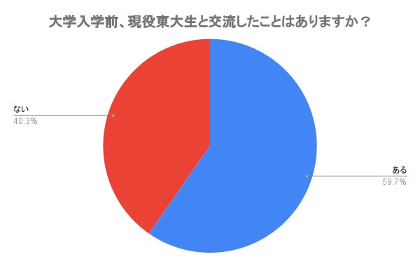 現役東大生300人に「大学入学前、現役東大生と交流したことはありますか?」と質問したところ、「ある」と答えたのは59.7%と6割近くが東大に通う現役生の姿をみていたことがわかりました。