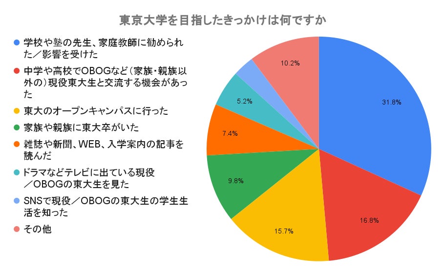 東京大学を目指したきっかけは、「学校や塾の先生、家庭教師に勧められた/影響を受けた」(31.8%)に次いで「中学や高校でOBOGなど(家族・親族以外の)現役東大生と交流する機会があった」(16.8%)と「東大のオープンキャンパスに行った」(15.7%)が多く、3割以上が現役東大生との触れ合いがきっかけになったことが明らかになりました。