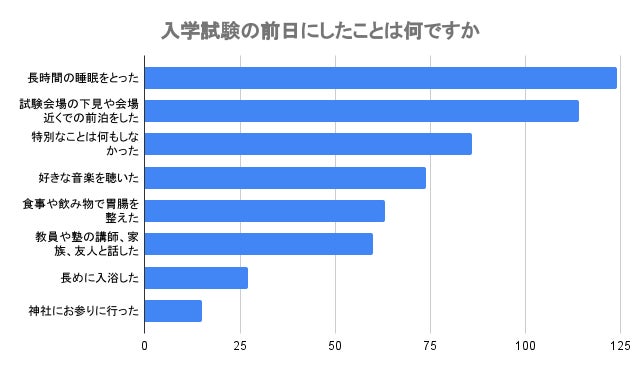 また「入学試験の前日にしたことは何ですか」という質問もしたところ(複数回答)、「長時間の睡眠をとった」と回答したのが125人で最も多く、次に多かったのは「試験会場の下見や会場近くでの前泊をした」(114人)でした。回答者の28%となる86人は「特別なことは何もしなかった」と回答し、「好きな音楽を聴いた」(74人)や「教員や塾の講師、家族、友人と話した」(60人)と普段通りの生活でリラックスすることを意識した人も多くいました。