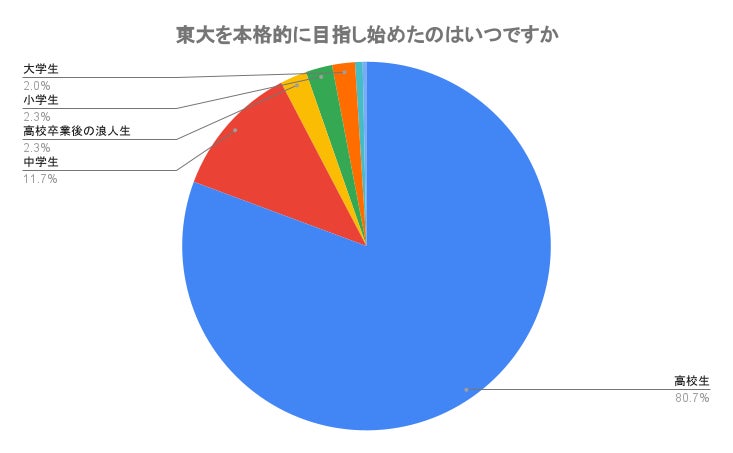 また、東大を本格的に目指し始めた時期を聞いたところ、最も多かったのは「高校生」で80.7%でした。「中学生」と答えたのは11.7%で、9割以上が中高時代に東大を目指し始めたことがわかりました。