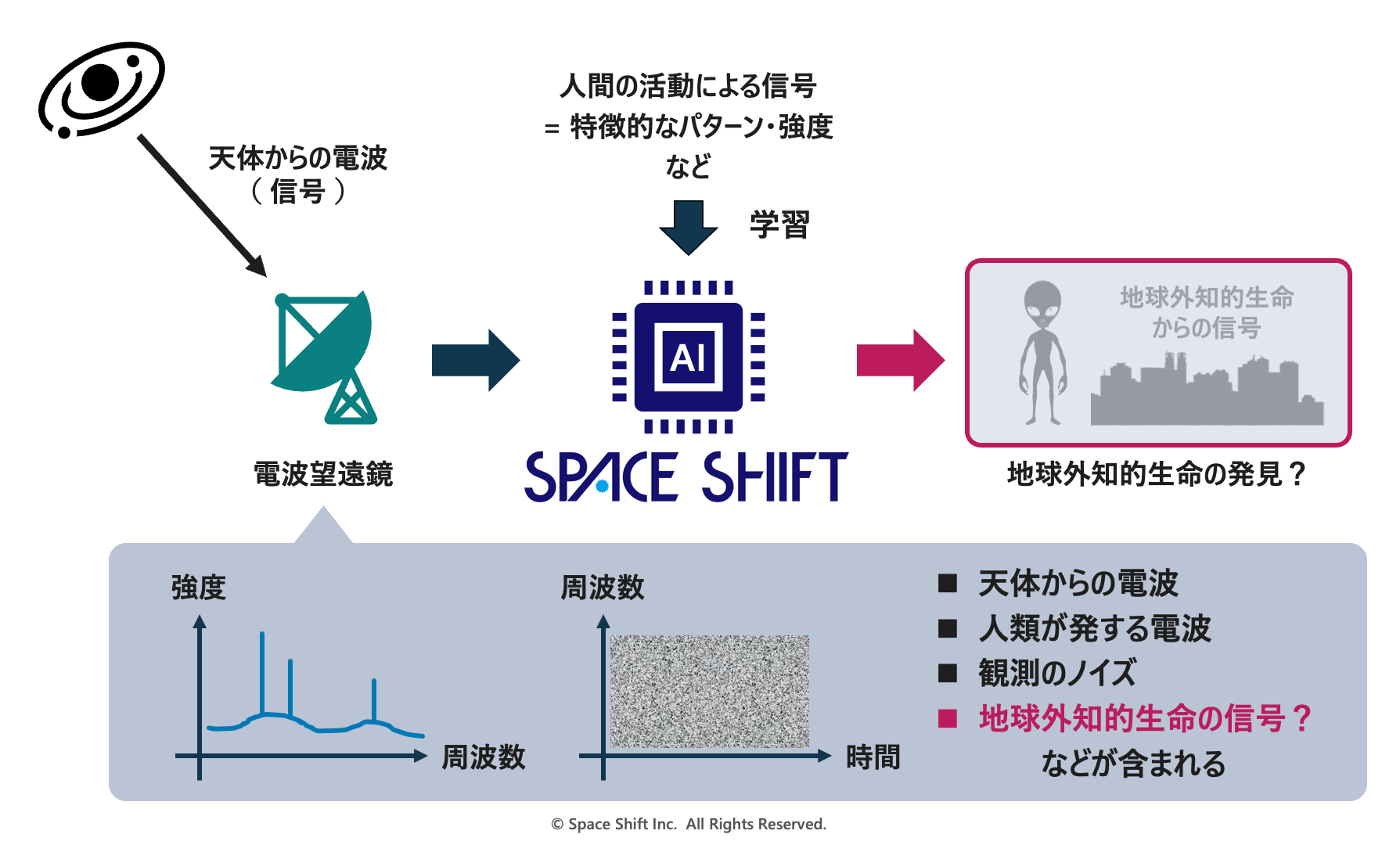 スペースシフトは、これまで地球観測衛星から得られるデータの解析を目的としてさまざまなAIを開発してきました。特にSAR衛星と呼ばれるレーダーを利用した地球観測衛星のデータ解析技術については、元データとなる電波の波形そのものから変化検知を行うAIを開発しており、その電波の解析技術を、SETI の分野に応用します。SETI の中で検知したい信号は、観測データにおける突出した信号や現在地球上から宇宙に放出されている信号に類似したパターンです。使用するデータは世界各国で運用されている電波望遠鏡の公開データを利用し、AI に天体由来の信号や観測ノイズ、地球からの人為的な信号など様々な要素を学習させ、これまで発見することのできなかった、地球外知的生命からの信号を見つけ出せないかと考えています。このようなAIを使った取り組みは 2018 年ごろから行われていますが、AI の専門家を多数擁するスペースシフトの強みを活かし、より高度なAIによる検知を目指します。