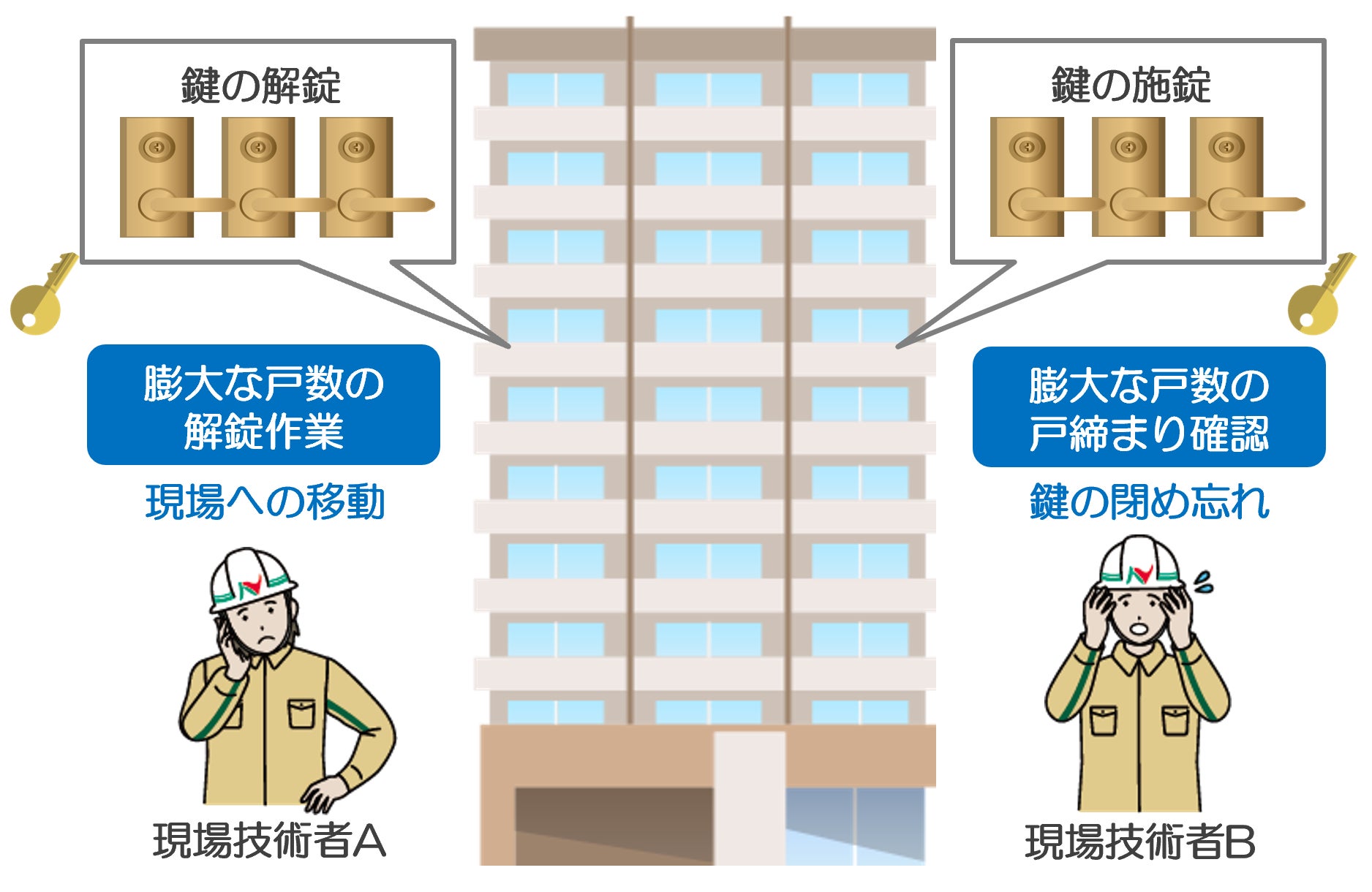 共同住宅の工事現場では、内装工事中、侵入者により室内の仕上げ等が損傷されることのないよう管理する必要があるため、現場技術者は毎日、膨大な戸数の玄関扉の鍵の解錠・施錠を行っています。現場技術者がこの日常管理を行う上で、通常の鍵の解錠・施錠作業だけでなく、現場作業員への急な鍵の貸し借り等、移動に伴う作業時間のロスや鍵の閉め忘れといったトラブルの発生も見受けられます。このように、膨大な戸数の鍵の解錠・施錠は時間を要するだけでなく鍵の閉め忘れといったリスクも抱え、現場技術者にとって大きな負担となっています。そこで、現場技術者が本来の現場業務に時間を充てるためには、このような業務を削減することが重要です。