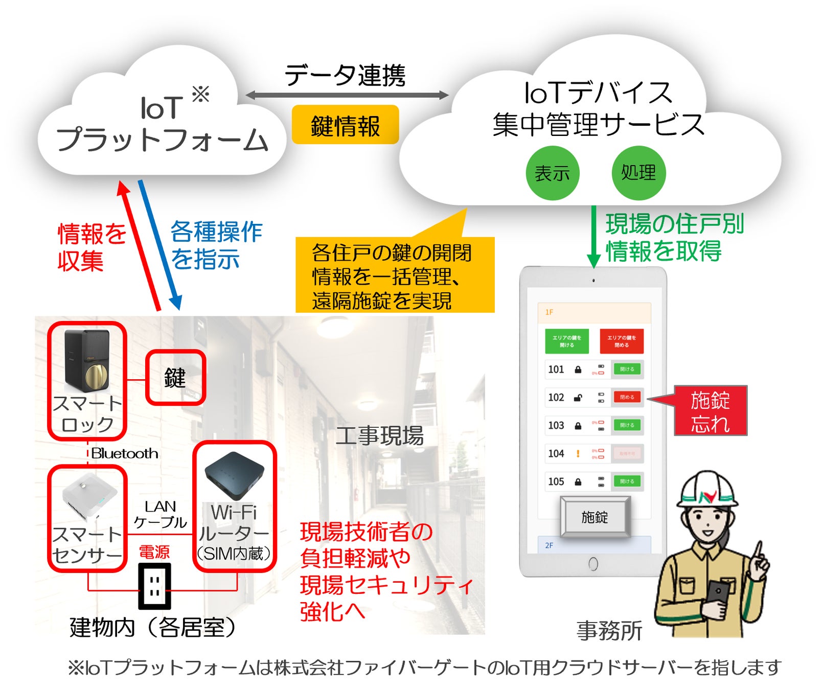 株式会社ファイバーゲート(東証プライム・札証:9450、本社:北海道札幌市、代表取締役社長:猪又將哲)は、西松建設株式会社(東証プライム:1820、本社:東京都港区、代表取締役社長:髙瀨伸利)と共同で、共同住宅の工事現場における鍵管理システムを開発しました。本システムは、主に共同住宅の工事現場において、各住戸の玄関扉にスマートロックを取り付け、専用アプリケーションで鍵の開閉情報を可視化し、鍵の解錠・施錠の遠隔操作を行うために開発したシステムです。現場技術者が携帯端末から各住戸の鍵の開閉情報を確認、遠隔操作できることで、管理業務の省力化を実現します。