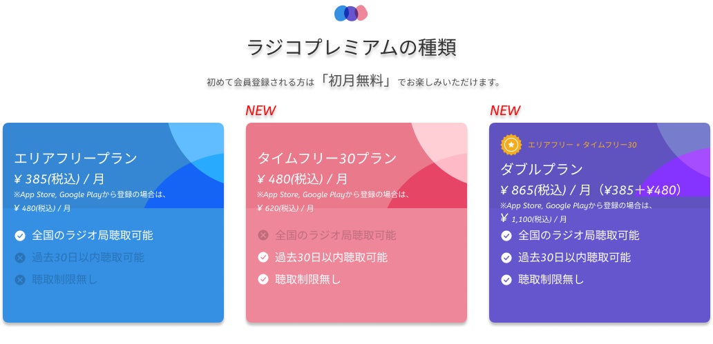 従来のラジコプレミアム「エリアフリープラン」に加えて、「タイムフリー30プラン」「ダブルプラン」ではより多くのラジオ番組を長く楽しむことができます。