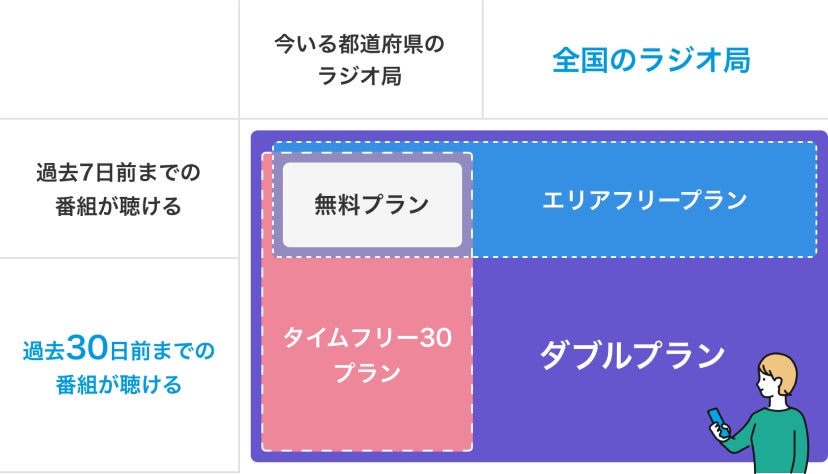 また、「ダブルプラン」に加入するとエリア外の番組も過去30日間聴けておトクなプランで番組を聴くことができます。