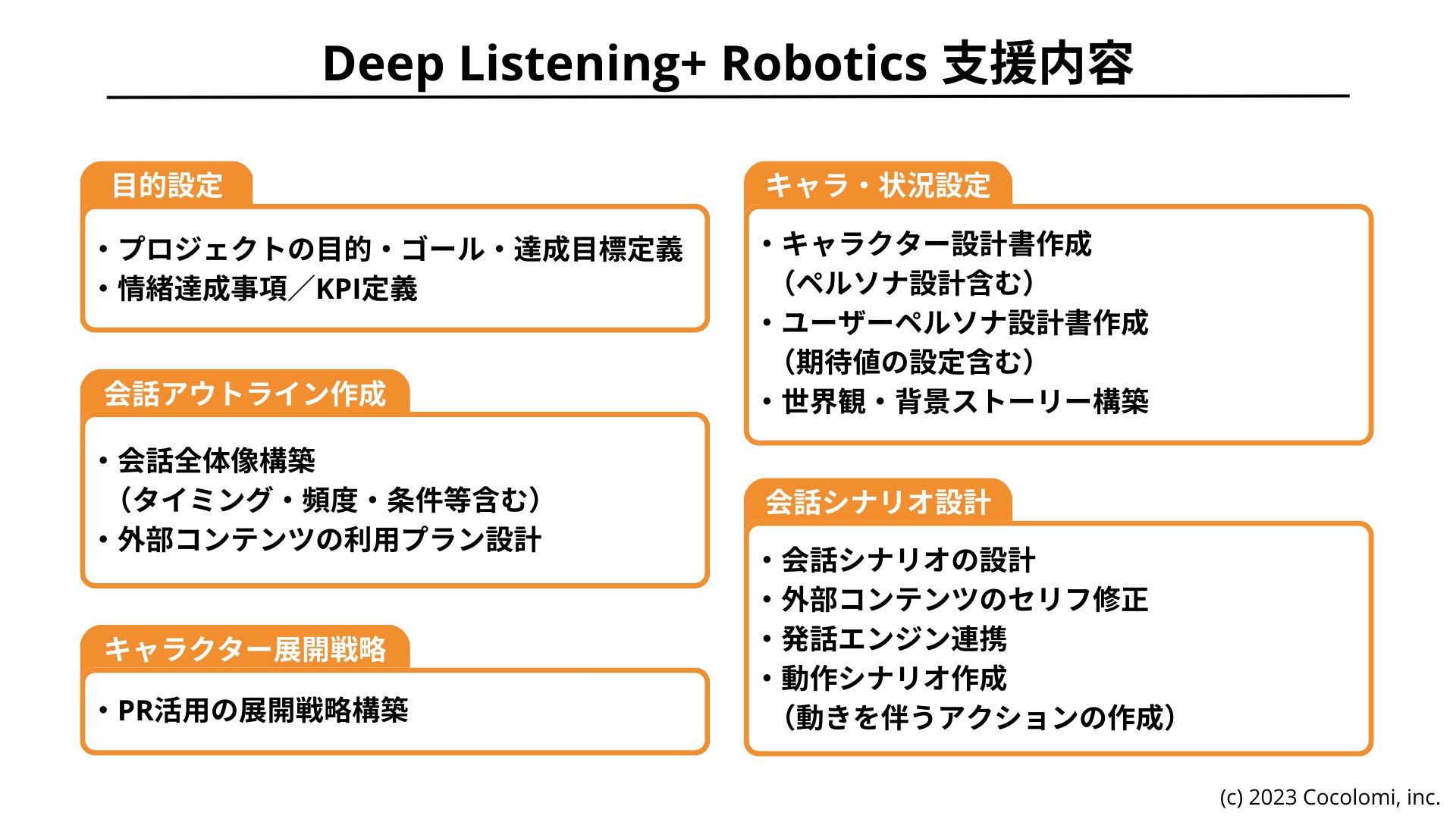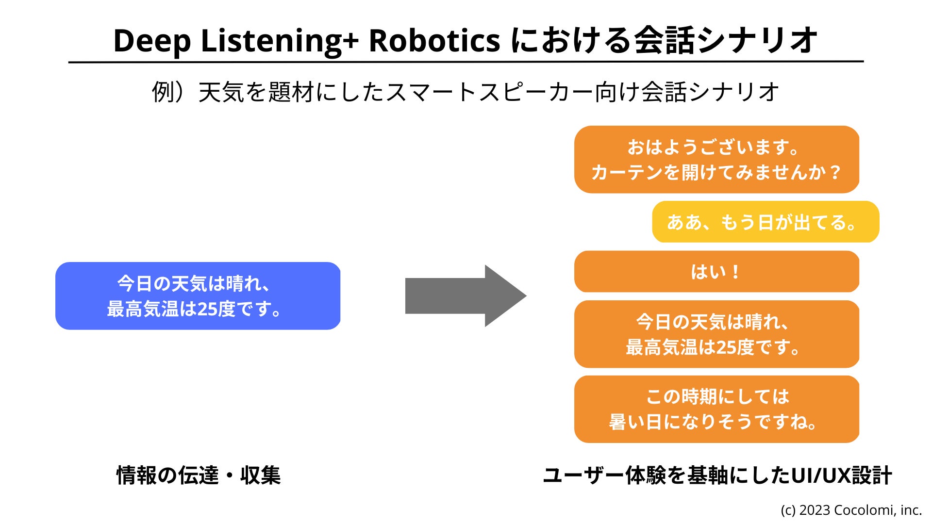 これまで、ロボット・スマートスピーカー・チャットボットの会話シナリオ開発の実績があります。