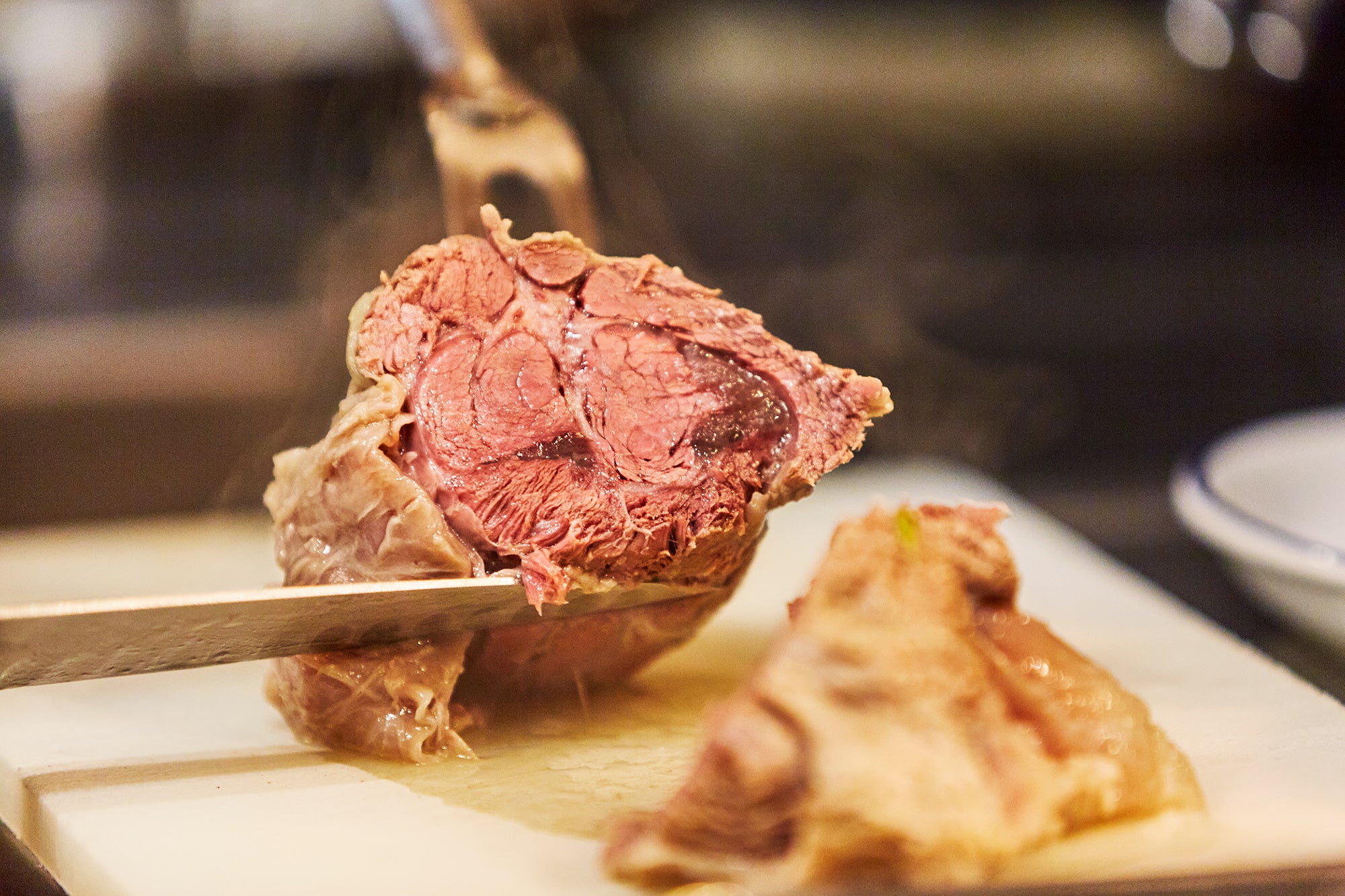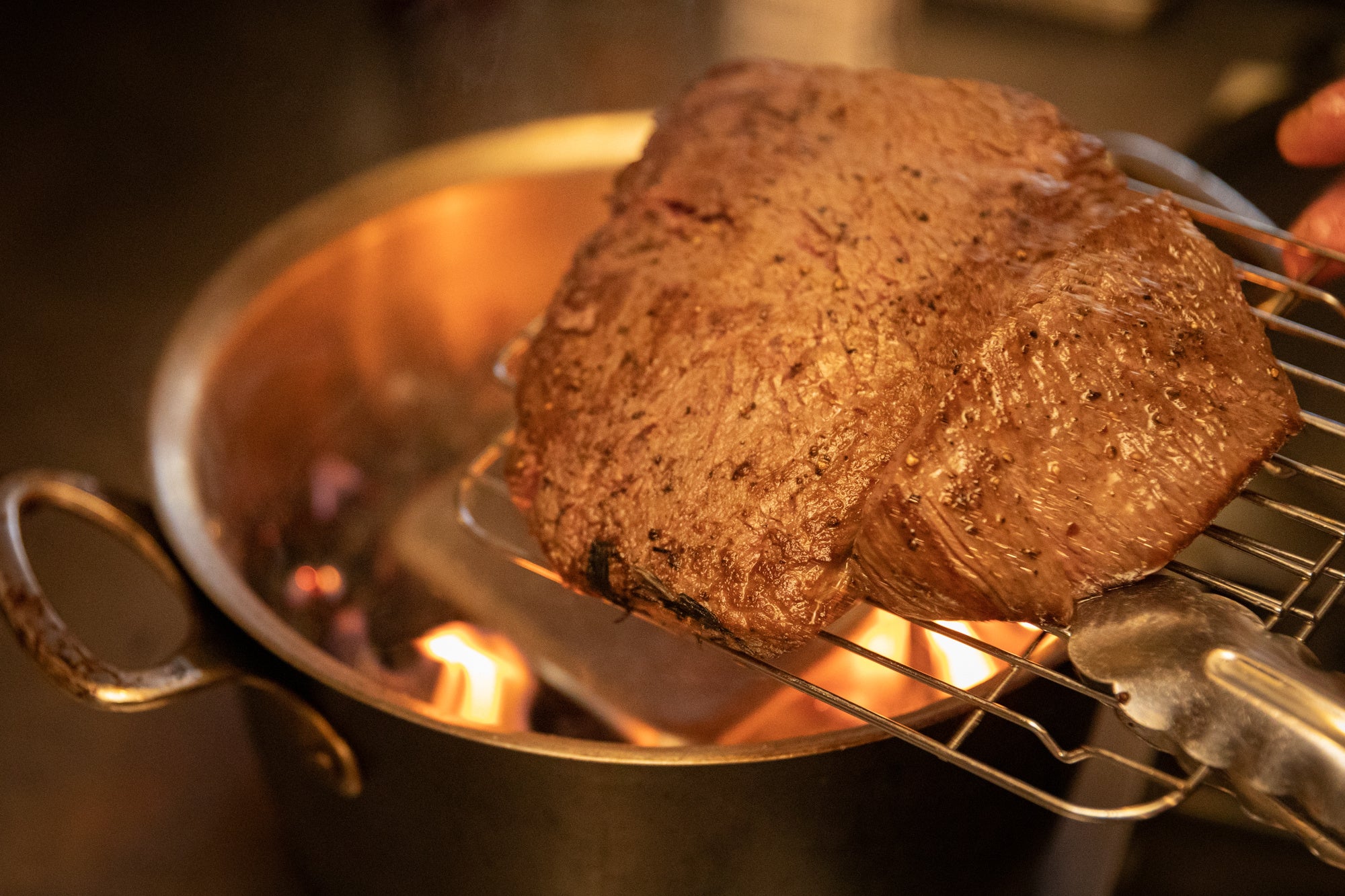 オープン初日から6年以上、連日満席という快進撃を続ける東京・銀座の人気店「ビストロシンバ」。菊地佑自シェフはフランスの三ツ星レストランやビストロで10年修業を重ね、2015年に同店を開業した。程よくサシが入った常陸牛の赤身部位シンタマの中心、シンシンを塊でローストにし、和牛ならではの豊かな脂の旨味を、燻した稲藁の香りとレフォール(ホースラディッシュ)の辛みで中和させて、塊肉でも食べやすいよう工夫が施されている。