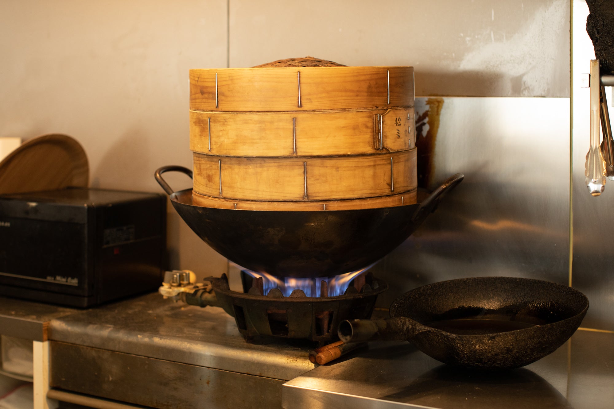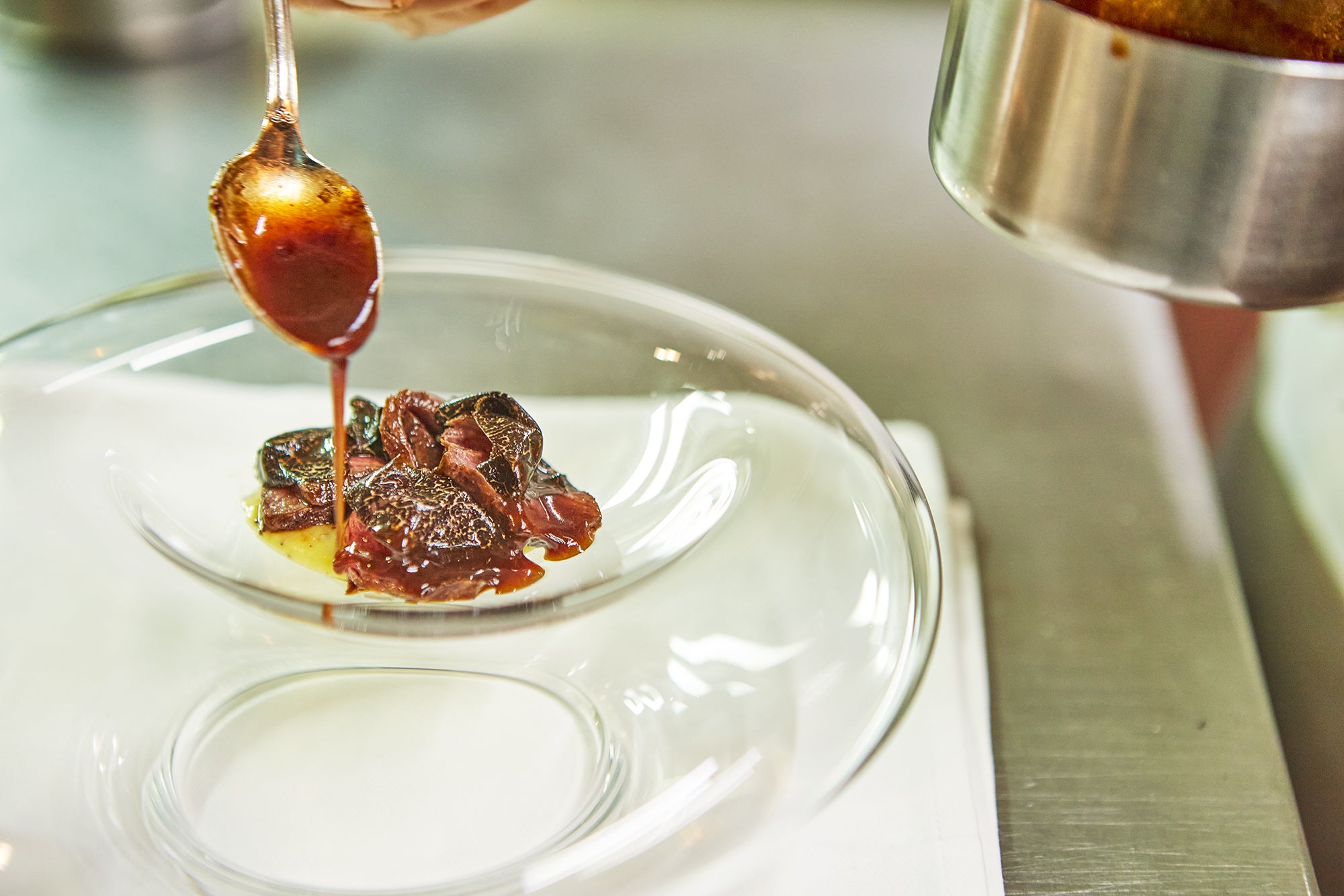 伝統的な上海料理をベースとしたオリジナリティあふれる料理が人気の東京・青山「ミモザ」。ヌーベルシノワの名店として知られる東京・新宿「シェフス」で料理長を務め、2016年に南俊郎シェフがオープンさせた。角切りにした常陸牛ランプ肉は、茹でたタケノコ、酒に漬けた貝柱、鶏ガラスープ、日本酒と共に碗に入れて蒸す中国料理ならではの手法「蒸しスープ」として提供する。常陸牛の旨味が体中に沁み渡るようなスープに、パンチのある自家製ラー油を添える。