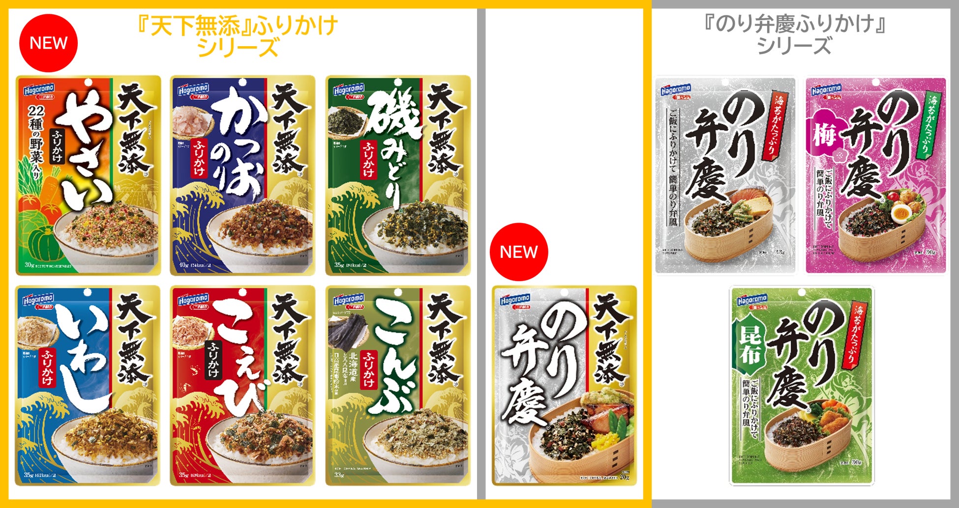 着色料・甘味料不使用が特長の『天下無添』ふりかけシリーズから、ブロッコリーやキャベツ・かぼちゃ・トマト・にんじん等22種類の野菜を使って野菜本来の甘みをお楽しみいただける「天下無添やさいふりかけ」と、ふりかけるだけでのり弁風のごはんができる人気の「のり弁慶ふりかけ」の味をそのままに、甘味料・着色料を使わずに同じ味を再現した「天下無添のり弁慶ふりかけ」を発売します。