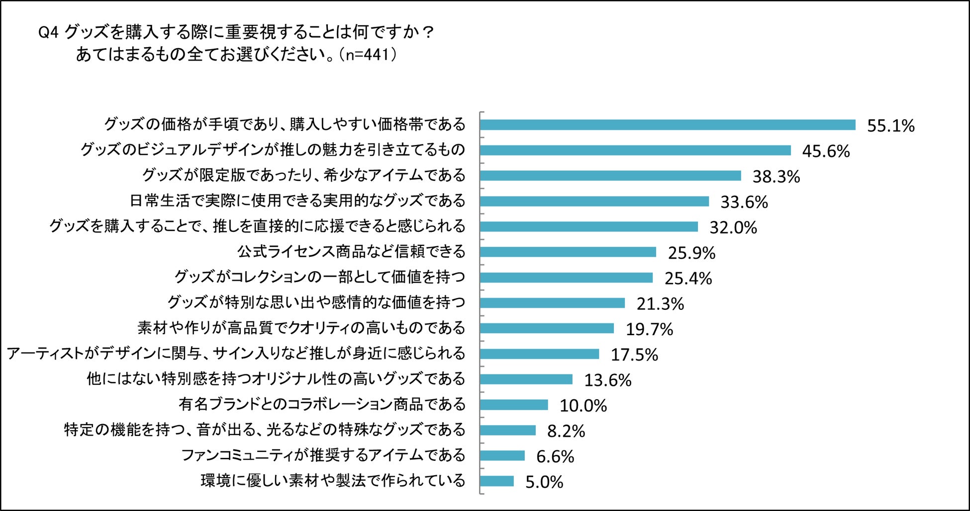 グッズ購入の際に重要視することとして、価格(55.1%)、デザインの魅力(45.6%)、希少性(38.3%)が大きな役割を果たしていることがわかりました。自分の推しを象徴するような視覚的に魅力的なデザインであること、限定版やサイン入りグッズなど、他では手に入らないアイテムであることに加え、手頃な価格で購入できることが重要な要素になっています。