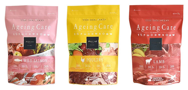 また、2020年に誕生した「POCHI ザ・ドッグフード『エイジングケア』シリーズ」は、これから犬と共に“味わい深い”よい時間をできる限り長く過ごしてほしい、そんな思いから生まれた、まったく新しいコンセプトでつくった3歳からのシニアフードです。「もっと早くから何かしてあげればよかった」と後悔する前に、中年期にさしかかる3歳から始められるエイジングケアシリーズの動物性タンパク源は、新鮮生肉100%使用。トッピングフレンドリーはそのままに、シニア期のトラブルが出る前に使い始めたい健康維持成分を11種類も配合しました。(https://www.pochi.co.jp/ext/the-dogfood-ageingcare.html)