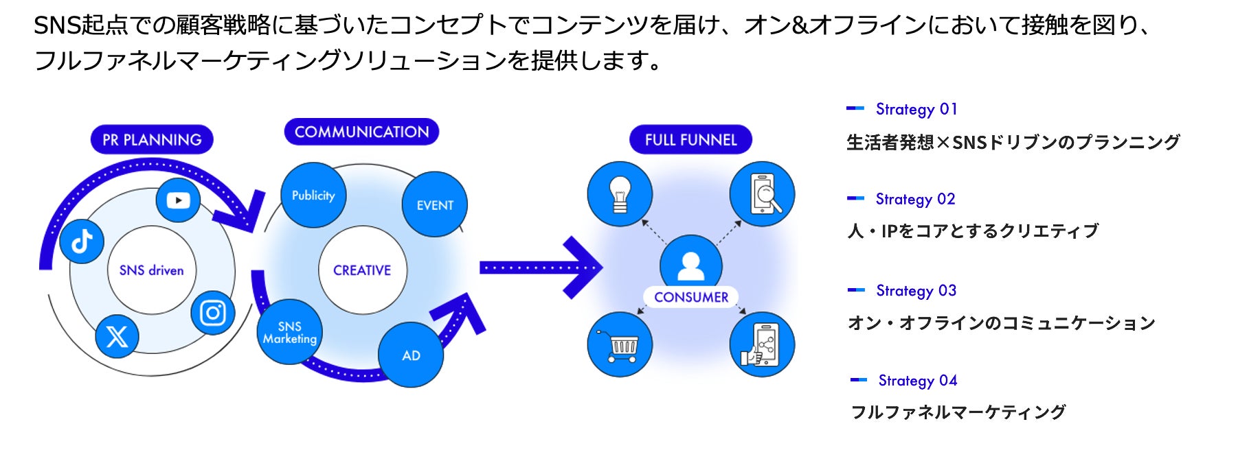 SNS起点での戦略立案と実行を自社内のリソースで完結することで、生活者目線・PR目線でのフルファネルに対応するマーケティングソリューションをご提供いたします。