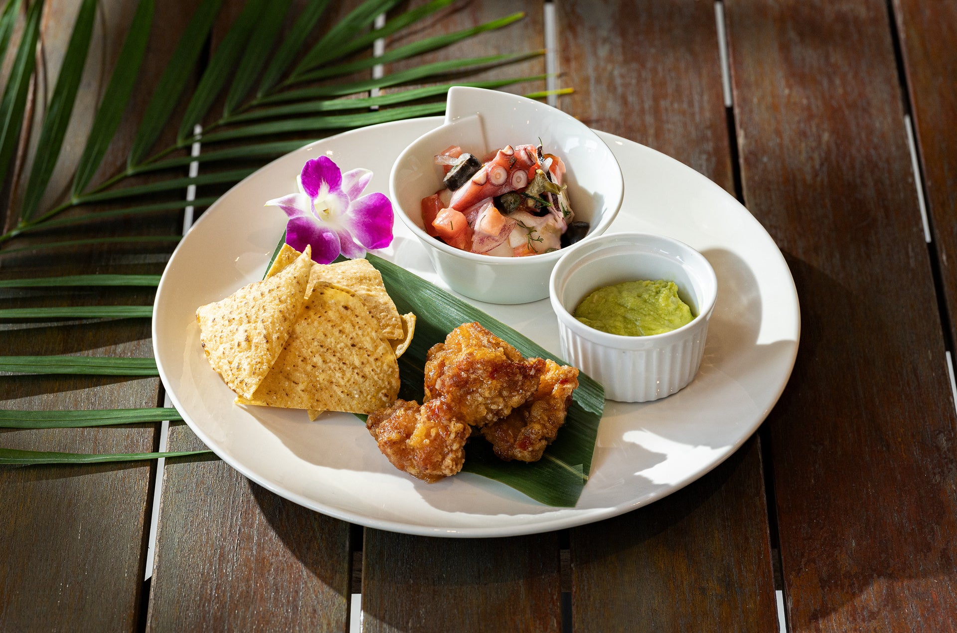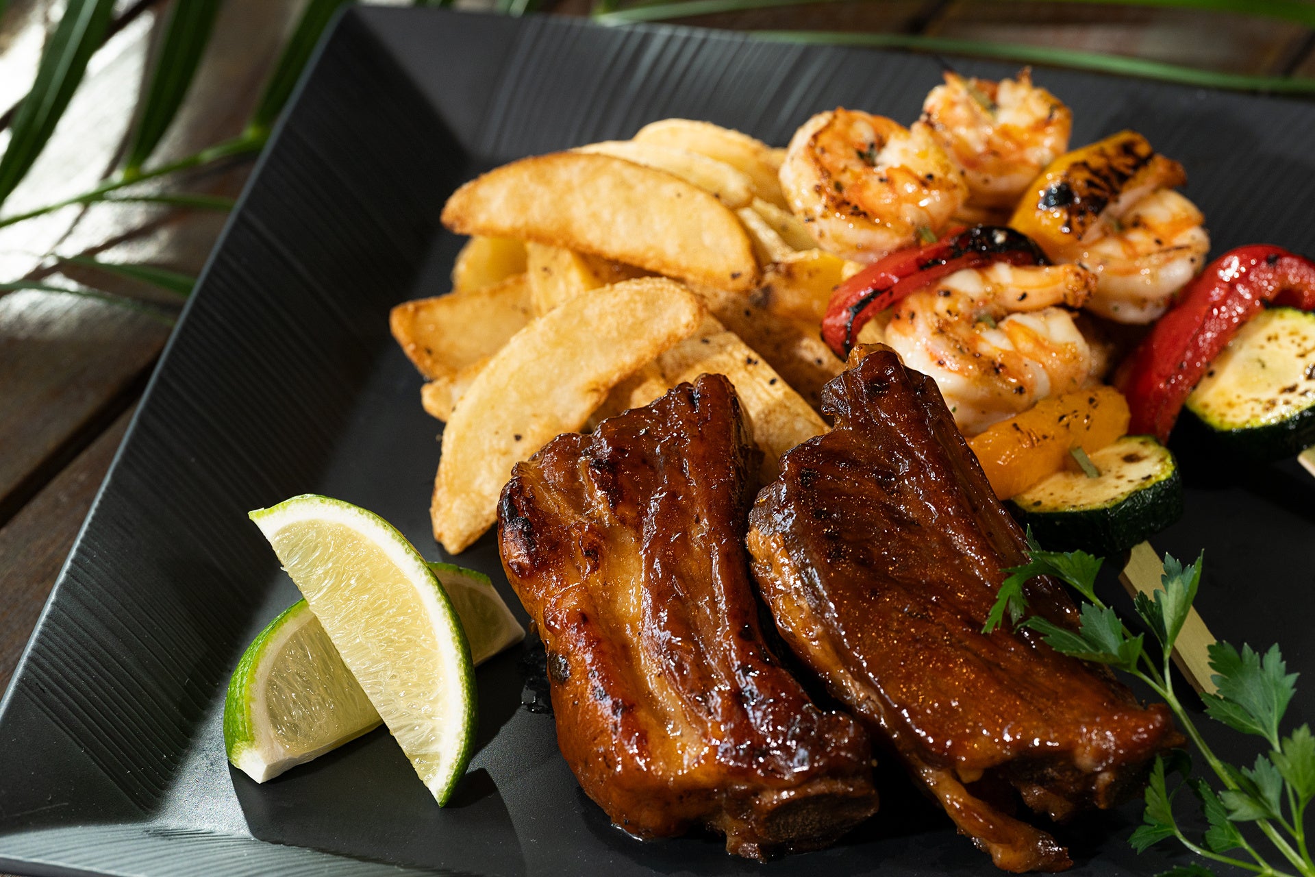 みなとみらいの夜景を望むルーフトップテラスでの「オーシャンズバー」では、この夏も多彩なフードラインナップをご用意しております。一番人気のミドルコースには、グランドオリエンタル特製のたれでじっくり煮込んだ**自慢のシグネチャーフード「スペアリブ」**が登場。ボリューム満点の味わいで、ご満足いただけること間違いなしです。そのほかにも、軽めのおつまみにぴったりなオードブル中心のライトコースや、記念日などの特別な夜におすすめのアニバーサリーコースもラインナップ。さらにアラカルトメニューでは、香り豊かなトリュフポテトやジューシーな唐揚げ、そしてデザートには果肉たっぷりのパイナップルブリュレなど、トロピカルな味わいを楽しめるメニューも充実しています。夜風を感じるルーフトップで、食事も心ゆくまでご堪能ください。