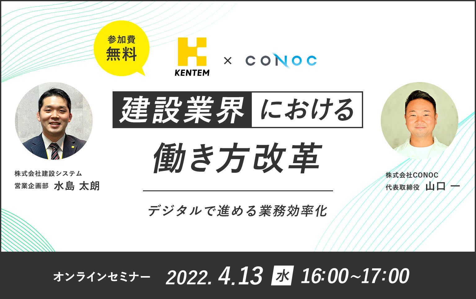 株式会社CONOC(本社:東京都渋谷区、代表取締役:山口一、以下CONOC)は、株式会社建設システム(本社:静岡県富士市、代表取締役:重森 渉、以下建設システム)と共催で、2022年4月13日(水)に無料オンラインセミナー「建設業界における働き方改革〜デジタルで進める業務効率化〜」を開催いたします。