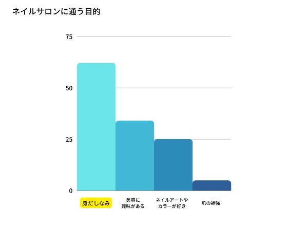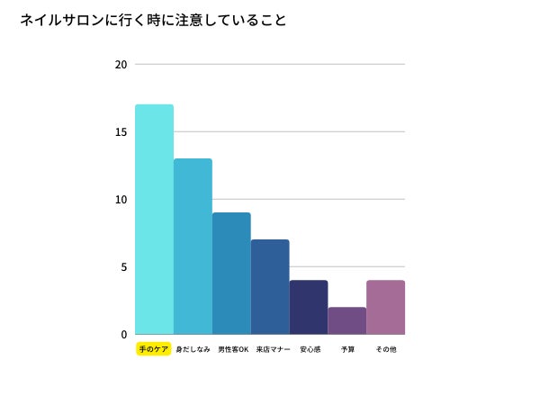 仕事や日常で手元を見られることが多い環境にいる方が多く、ネイルサロンに通う目的として最も挙げられたのは「身だしなみ」でした。指先をアートやカラーで彩るよりは清潔感を出すことを目的としている男性が多いようです。