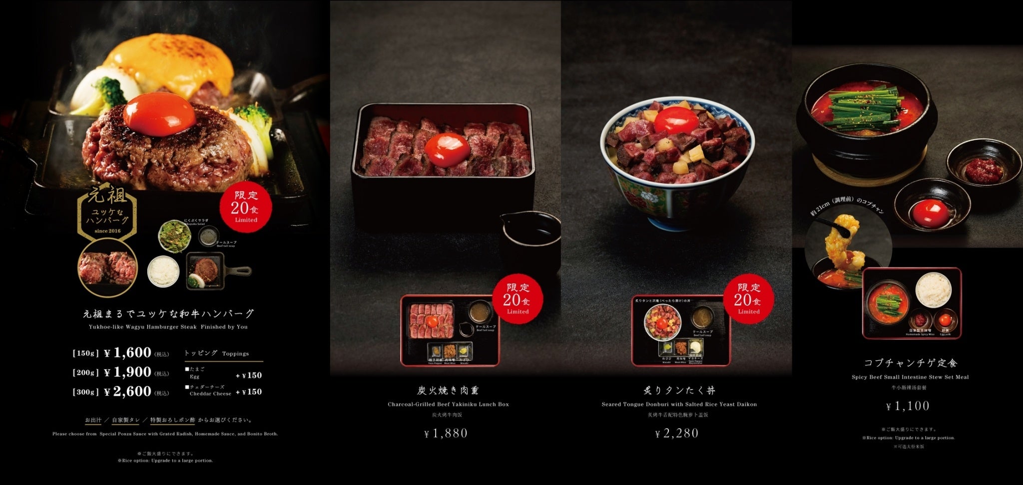 【炭火焼き肉重(限定20食)/炙りタンたく丼(限定20食)/コプチャンチゲ定食】の3種。