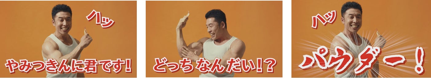 今回、ただただ幸せな笑いを提供するなかやまきんに君さんを起用。WEB CMでは“やみつきんに君”として登場していただきます。自身の筋肉に、「ハッピーターンあなたのやみつき体験募集!キャンペーン」に応募するのか、しないのかを尋ねる“やみつきんに君”。最後は、持ち前のギャグ“パワー”を“パウダー”に変え、キャンペーンの参加を呼びかけます。