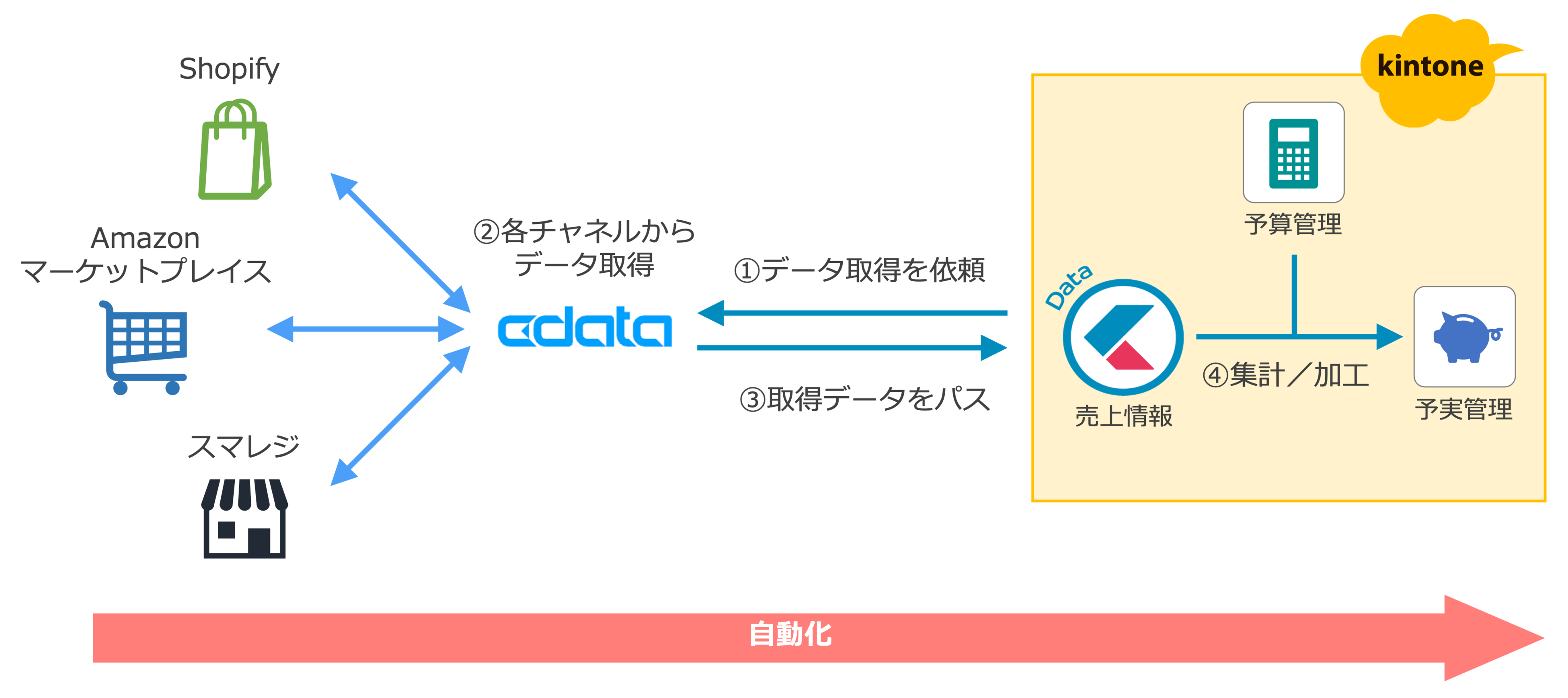 例えば、外部システムにある得意先マスタや商品データを取得してkintoneの顧客管理業務に活用したり、商品を複数チャネルに出店し計上された売上をkintoneで集計・分析したりといったことが可能になります。