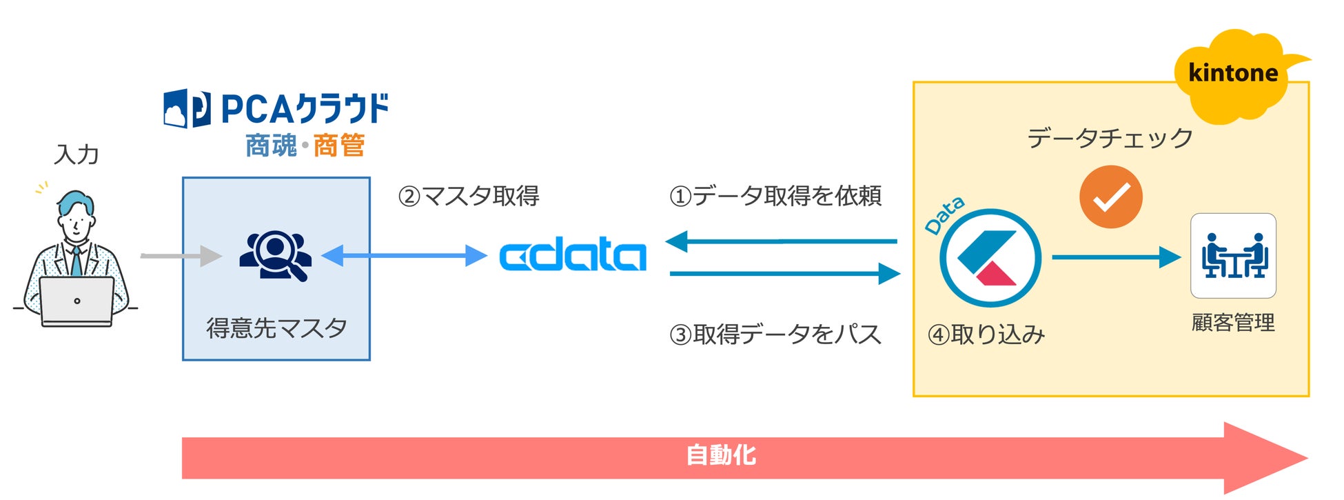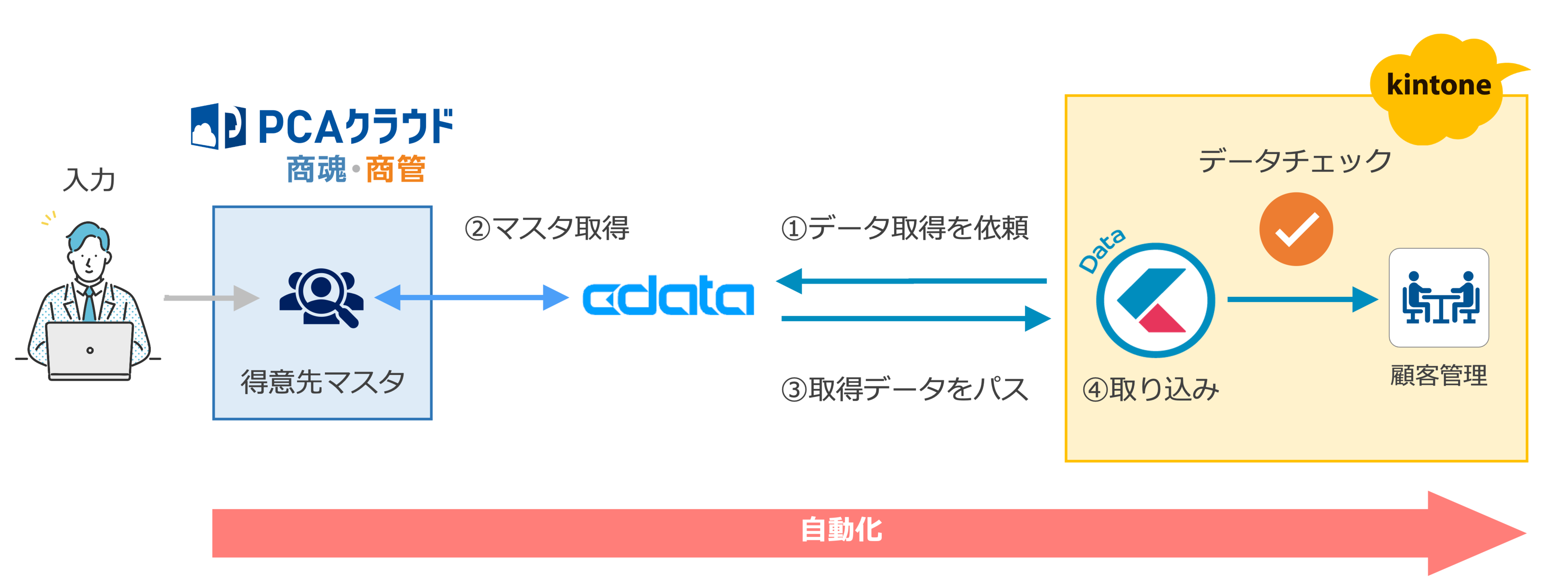 販売管理・仕入・在庫管理を行うPCA商魂・商管に登録された得意先や商品データを自動で取り込み、kintoneの顧客管理業務のマスタとして利用する。krewDataを介することでデータの入力漏れや文字揺れがないかチェックを行うことができる。
