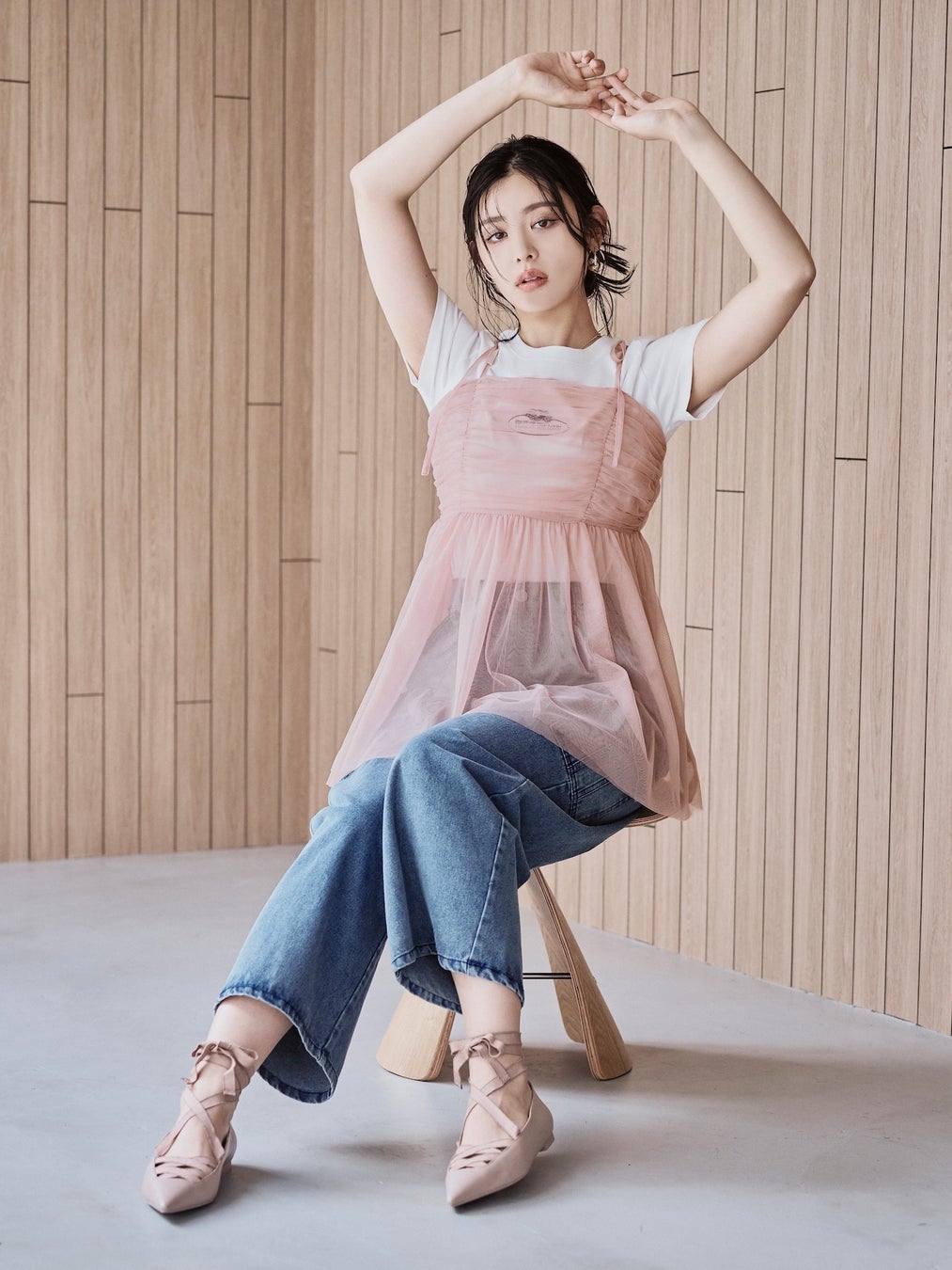 •コンパクトフルーツロゴ刺繍Tシャツ: オフホワイト ¥2,999(税込) •バックレースアップチュールキャミソール: ダスティピンク ¥4,759(税込) •デニムワイドカーゴパンツ: ブルー ¥8,759(税込)