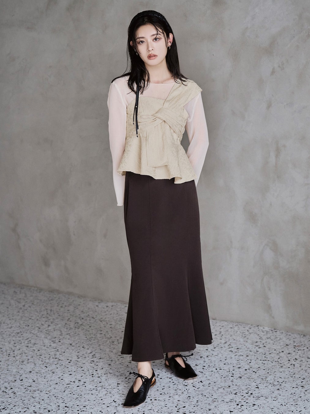 •アシメショルダージャガードキャミビスチェ: ベージュ ¥6,710(税込) •シアーボートネックフレアスリーブトップス: アイボリー ¥4,759(税込) •フレアマーメイドスカート: ブラウン ¥6,710(税込)