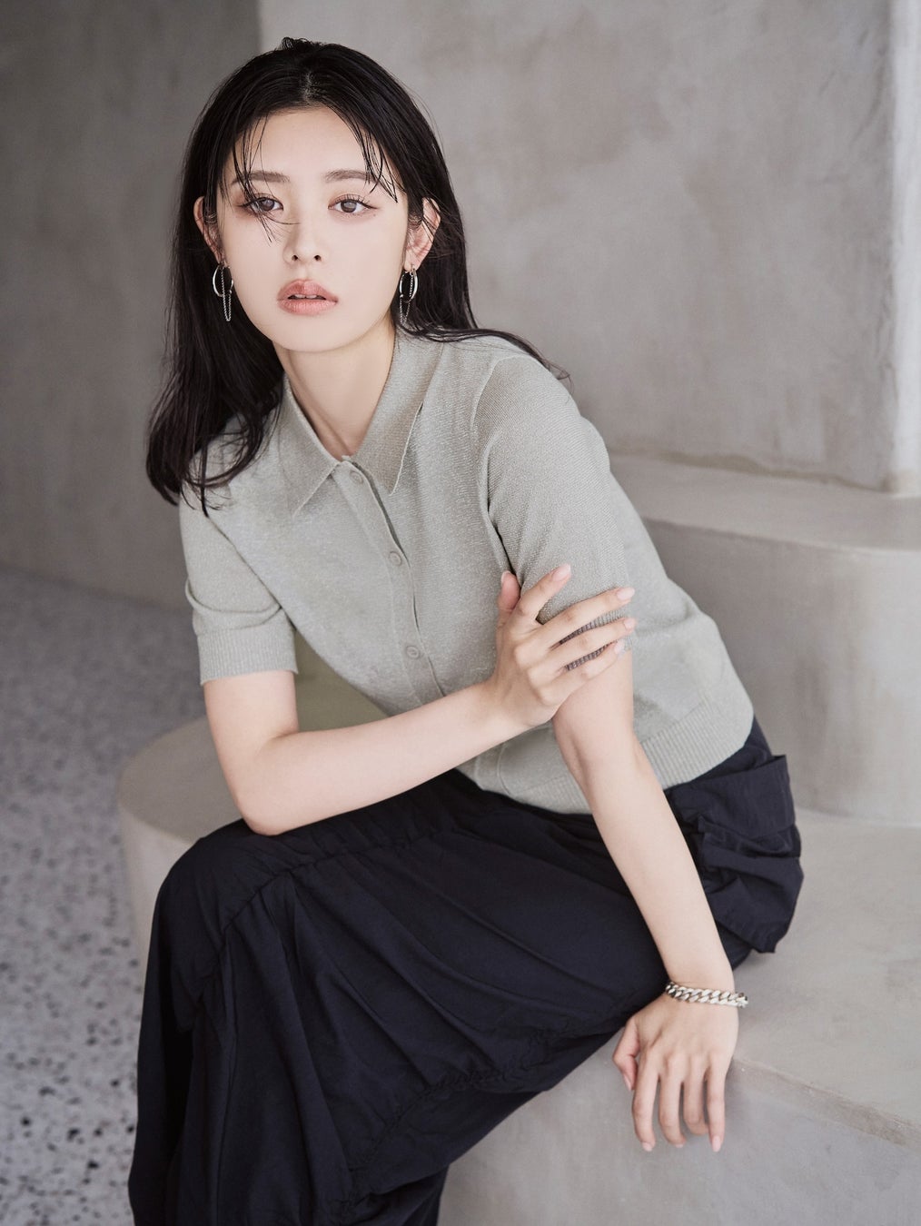 きらりと光るラメがトレンドライクなニットポロシャツ。すとんと落ち感のあるナイロンスカートと合わせてスッキリとしたシルエットのカジュアルコーデに。